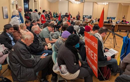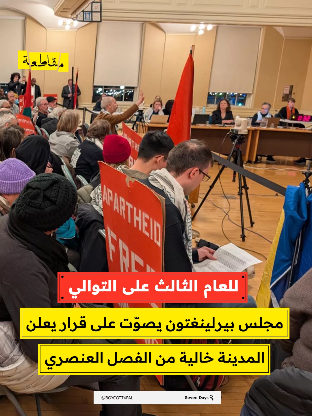 للعام الثالث على التوالي، يدرج مجلس مدينة بيرلينغتون (فيرمونت) على جدول أعماله قرارًا استشاريًا يعلن المدينة "خالية من نظام الفصل العنصري"، ويؤكد دعمه لحقوق الشعب الفلسطيني. القرار الذي يستند إلى حملات شعبية وضغوط من منظمات محلية، يدعو إلى إنهاء دعم أي أنظمة فصل عنصري أو استعمار عسكري، بما في ذلك النظام الإسرائيلي.