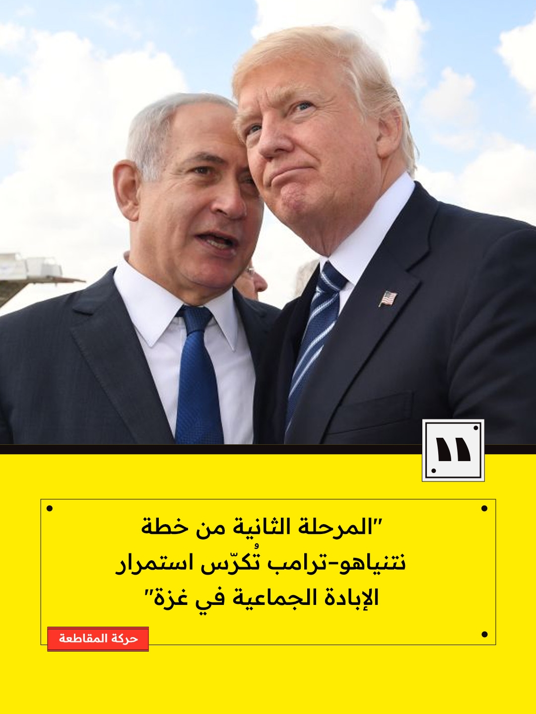 حذّرت حركة المقاطعة من أن إعلان الولايات المتحدة بدء المرحلة الثانية من خطة نتنياهو–ترامب غير الشرعية والاستعمارية لغزة يُمثّل امتدادًا مباشرًا للإبادة الجماعية الإسرائيلية، المدعومة أمريكيًا، بحق نحو 2.3 مليون فلسطيني في القطاع. ودعت الحركة إلى تصعيد الضغط الدولي لإنهاء هذه الجرائم وفرض عقوبات قانونية وموجّهة على مستوى العالم.
