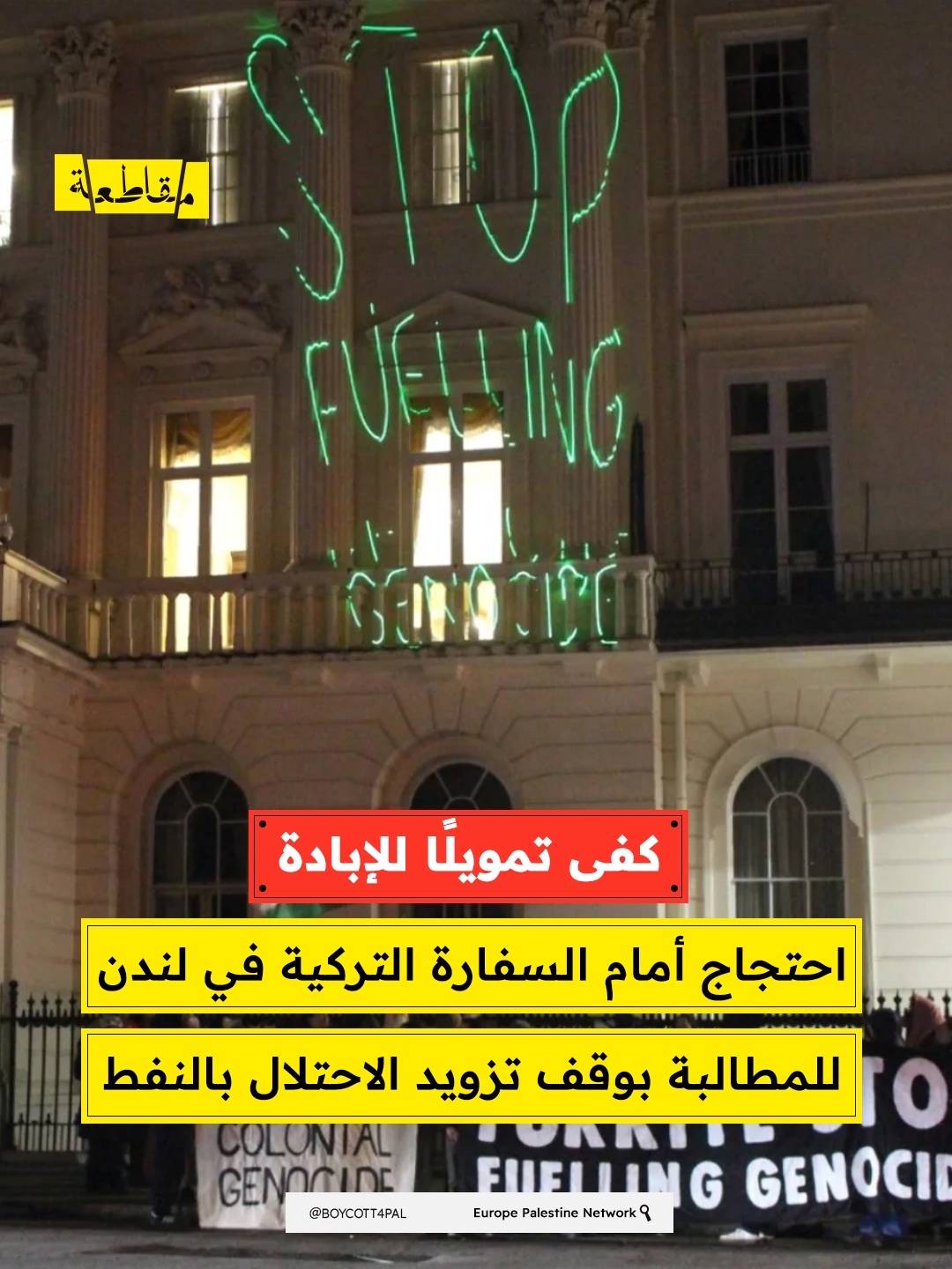 نظم ناشطون مؤيدون لفلسطين، مساء أمس الأربعاء، وقفة احتجاجية أمام السفارة التركية في العاصمة البريطانية لندن، ضمن اليوم الدولي للتحرك، للمطالبة بوقف تغذية الإبادة الجماعية بالوقود، عبر استمرار شحنات النفط إلى "إسرائيل".
