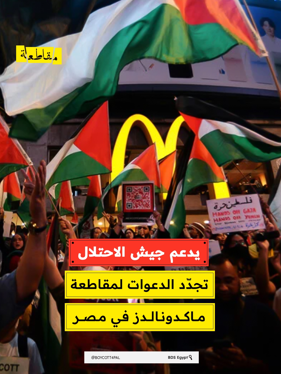 جدّدت حركة المقاطعة في مصر دعوتها إلى مقاطعة سلسلة مطاعم "ماكدونالدز"، مؤكدة أن دعم القضية الفلسطينية يبدأ من رفض المساهمة في الأنشطة الاستهلاكية التي تدعم الاحتلال بشكل مباشر أو غير مباشر.