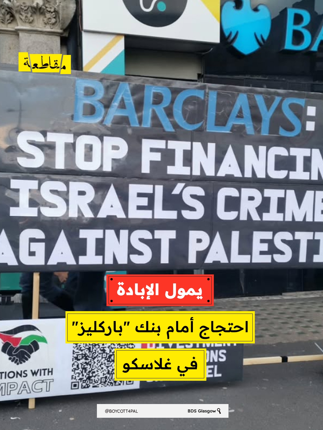احتجّ ناشطون ومتضامنون مع فلسطين في غلاسكو ، ضمن حملات تقودها مجموعات تضامن محلية من بينها مبادرة Actions With Impact، على استمرار بنك باركليز في تمويل شركات مرتبطة بتسليح الاحتلال، مشيرين إلى أن هذه الاستثمارات تشكل تواطؤًا مباشرًا في الجرائم المرتكبة بحق الشعب الفلسطيني، ولا سيما في ظل حرب الإبادة المتواصلة على قطاع غزة.