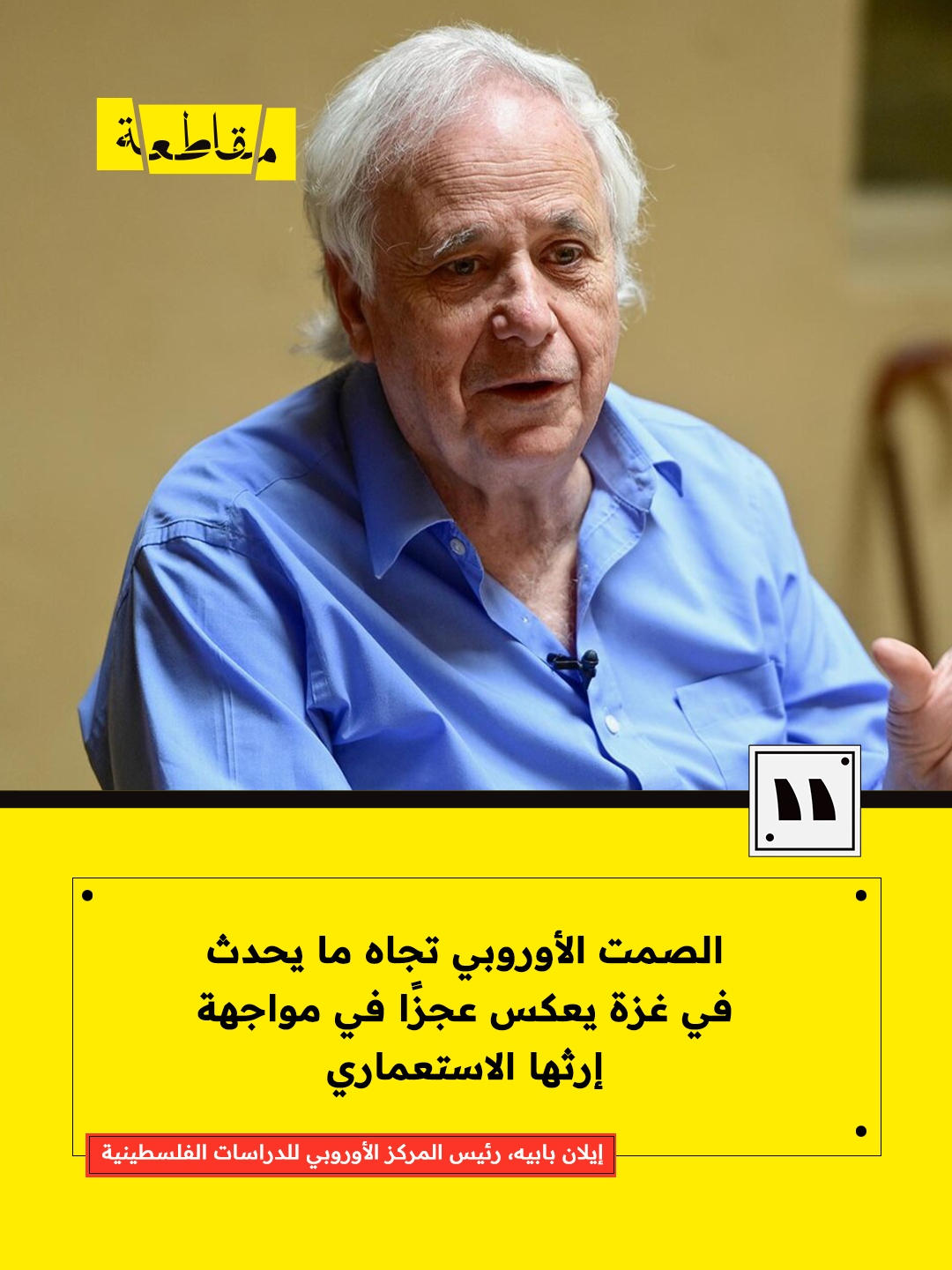 قال المؤرخ الإسرائيلي والناشط الأكاديمي إيلان بابيه، رئيس المركز الأوروبي للدراسات الفلسطينية، إنّ الصمت الأوروبي حيال ما يجري في قطاع غزة يعكس فشلًا عميقًا في مواجهة الإرث الاستعماري للقارة الأوروبية، مؤكدًا أنّ هذا الصمت ليس حيادًا، بل موقف سياسي متجذّر في التاريخ.