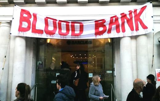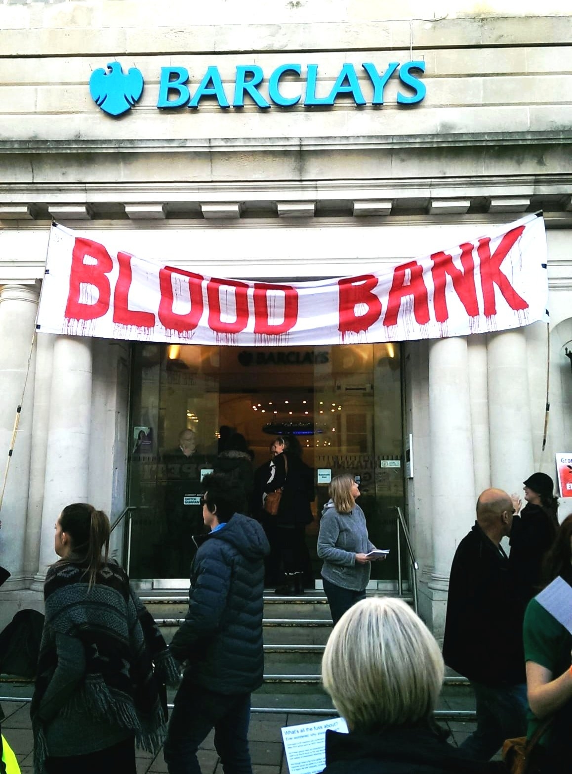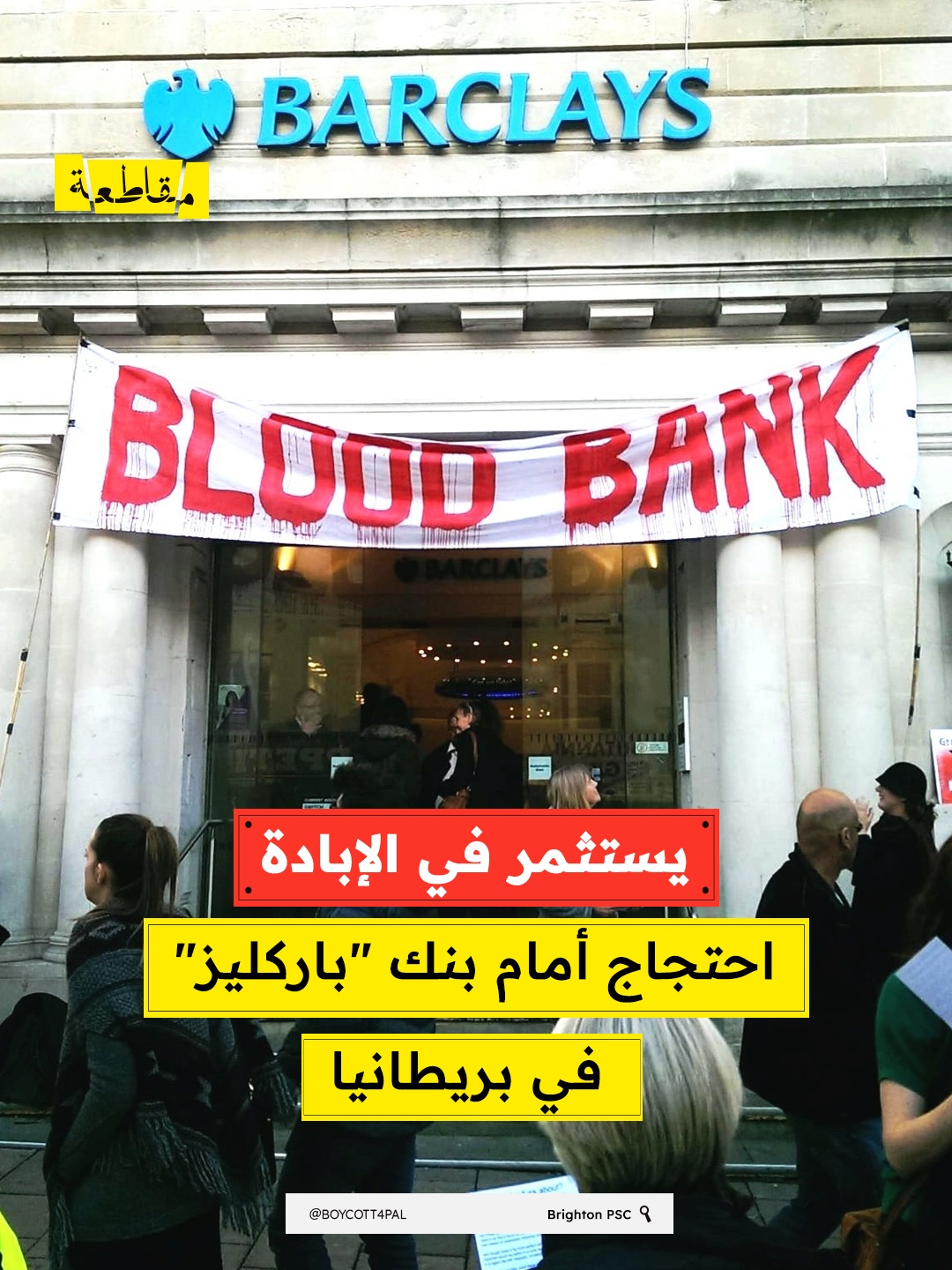نظم نشطاء من حركة التضامن مع فلسطين في برايتون ،بريطانيا، حتجاجًا أمام فرع بنك "باركليز" وسط المدينة، تنديدًا بدور البنك في دعم الاحتلال.