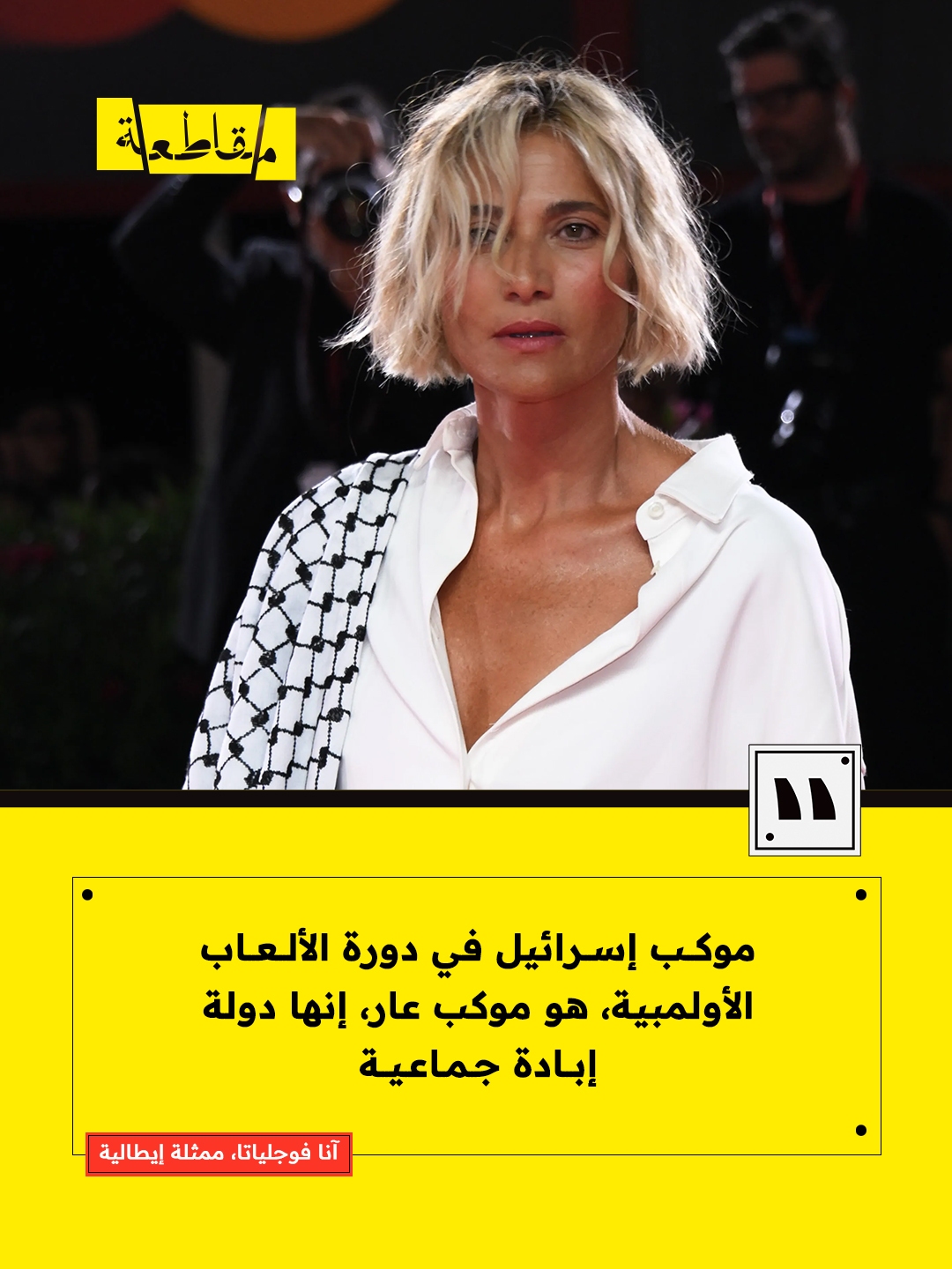 أدانت الممثلة الإيطالية آنا فوجلياتا مشاركة “إسرائيل” في دورة الألعاب الأولمبية الشتوية، ووصفت الحدث بأنه "موكب عار"، مشيرةً إلى أن إسرائيل "دولة إبادة جماعية تواصل قتل الأطفال والنساء والرجال الفلسطينيين وسط لامبالاة عالمية".