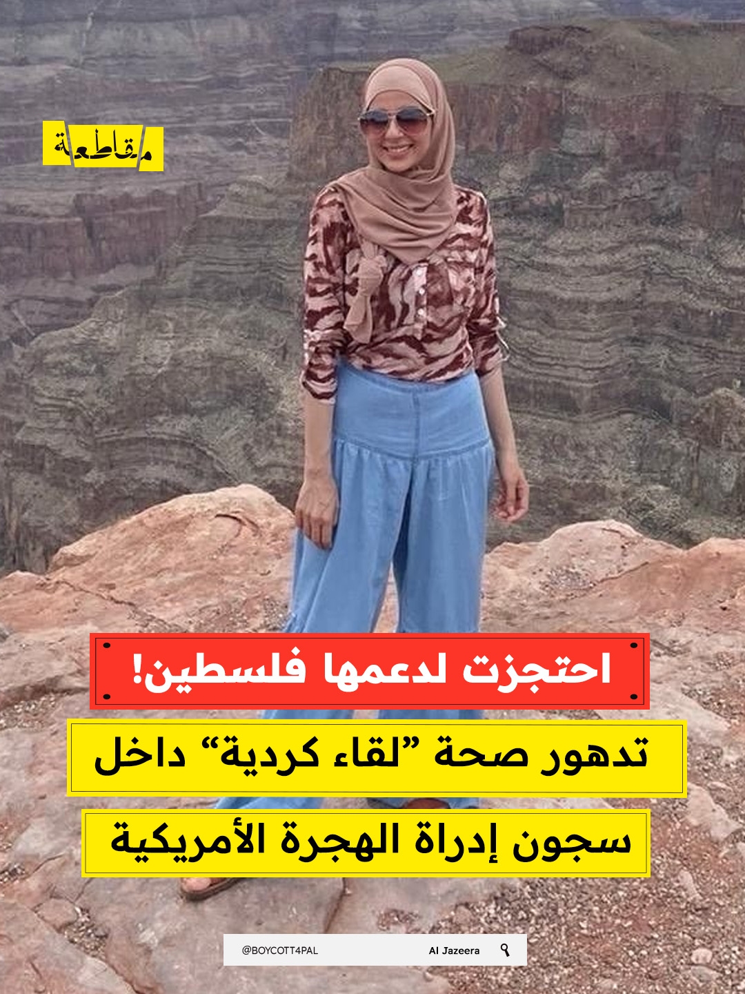 في المقابل، تؤكد كردية وعائلتها ومنظمات حقوقية أنها استُهدفت بسبب نشاطها السياسي المؤيد للفلسطينيين، وتصف ظروف احتجازها بأنها “قذرة ومكتظة وغير إنسانية”.
