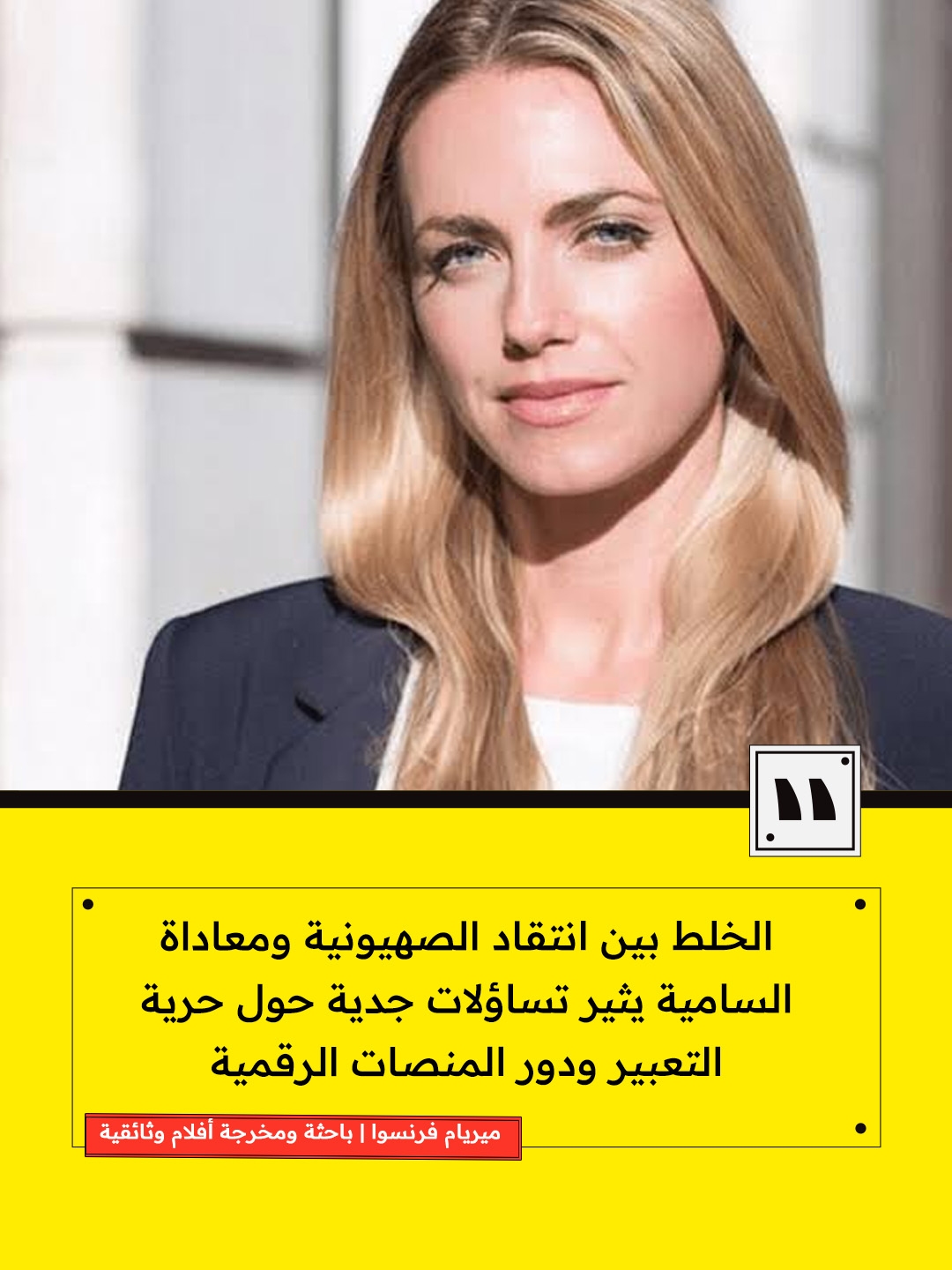 ميريام فرنسوا..الخلط بين انتقاد الصهيونية ومعاداة السامية يثير تساؤلات جدية حول حرية التعبير ودور المنصات الرقمية