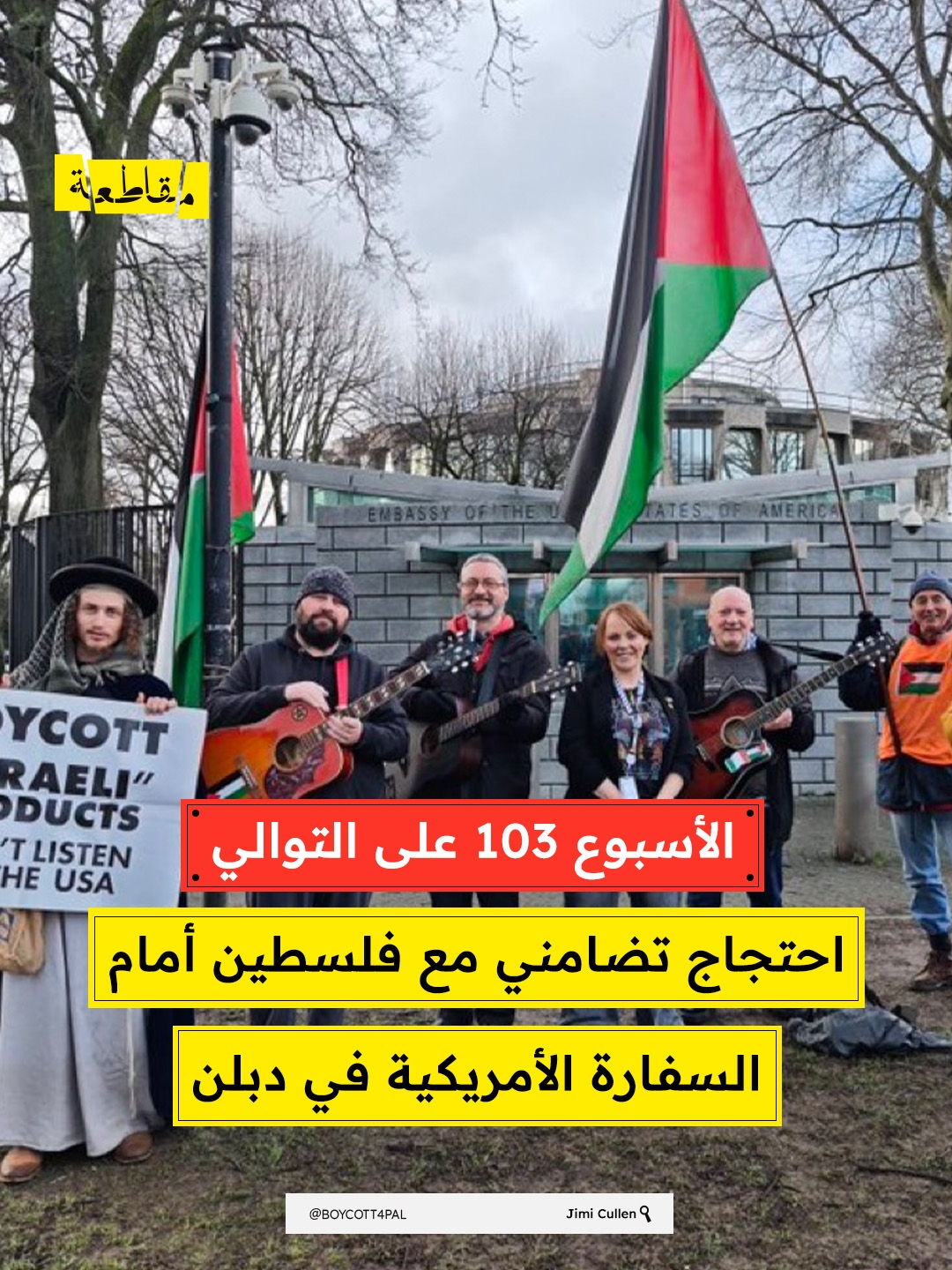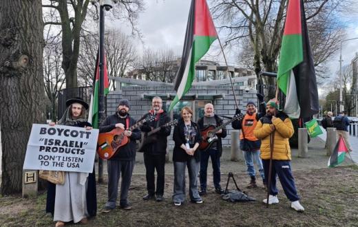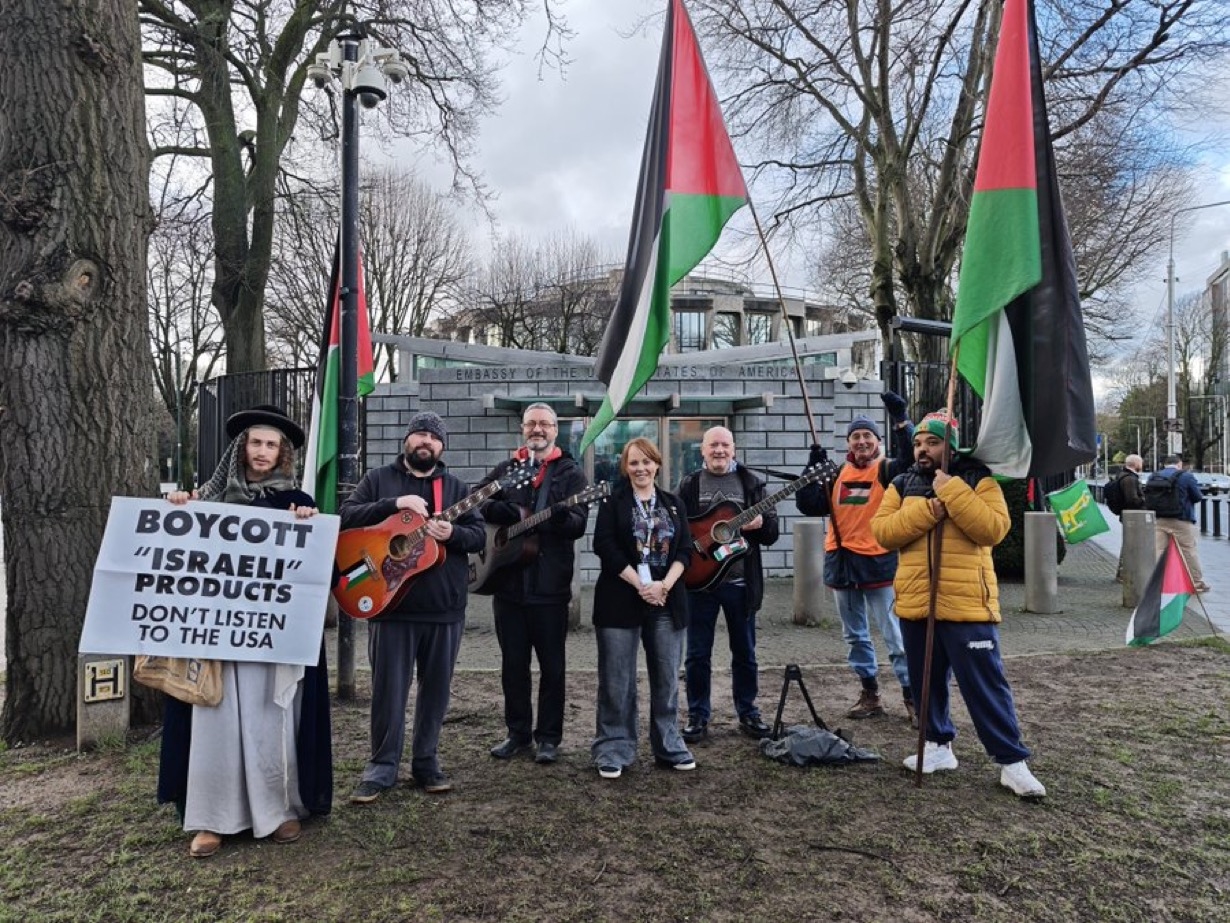 شهدت العاصمة الأيرلندية دبلن، وقفة احتجاجية تضامنية مع الشعب الفلسطيني أمام السفارة الأمريكية، وذلك ضمن الأسبوع الـ101 من التحركات الأسبوعية المتواصلة الداعمة لفلسطين. وشارك في الوقفة عدد من النش