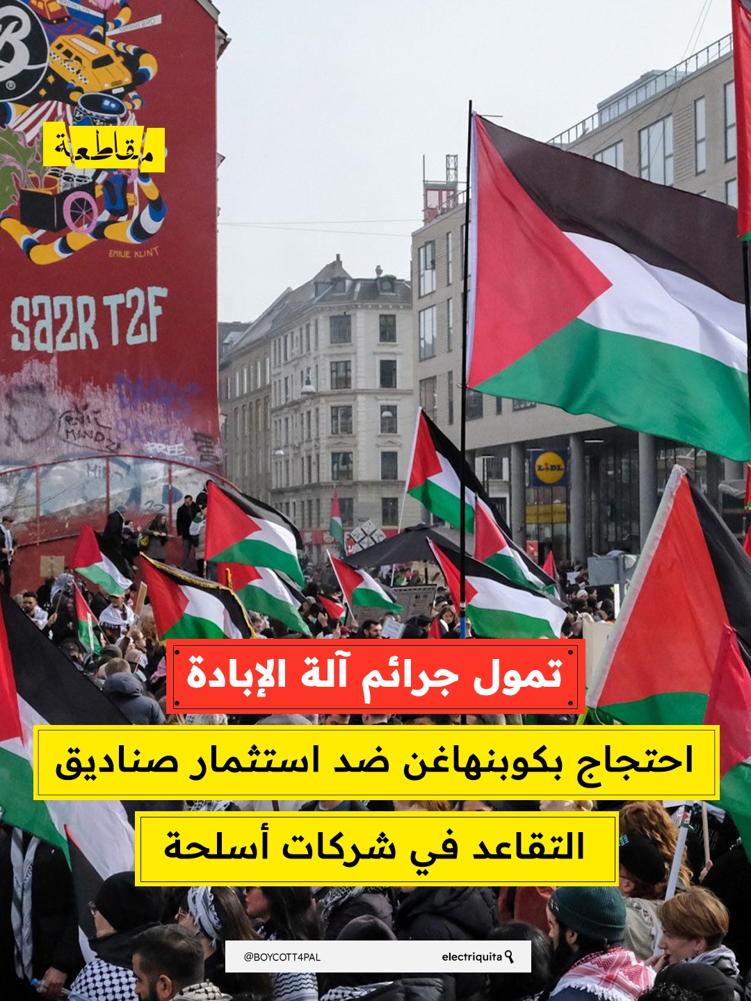 نفّذ ناشطون متضامنون مع فلسطين احتجاجًا أمام مقر أكبر نقابة عمالية في الدنمارك، 3F، في العاصمة كوبنهاغن، احتجاجًا على استثمار أموال صناديق التقاعد العامة في شركات أسلحة دنماركية تزوّد الجيش الإسرائيلي بالدعم والمعدات. وأكد النشطاء ان القوانين الدنماركية تدفع العمال بشكل إلزامي إلى صندوق التقاعد العام المعروف باسم ATP، الذي يُستثمر جزء من مدخراته في صناعة الأسلحة، ما يعني دعمًا مباشرًا للجرائم الصهيونية التي تمارس الفصل العنصري والإبادة في فلسطين.