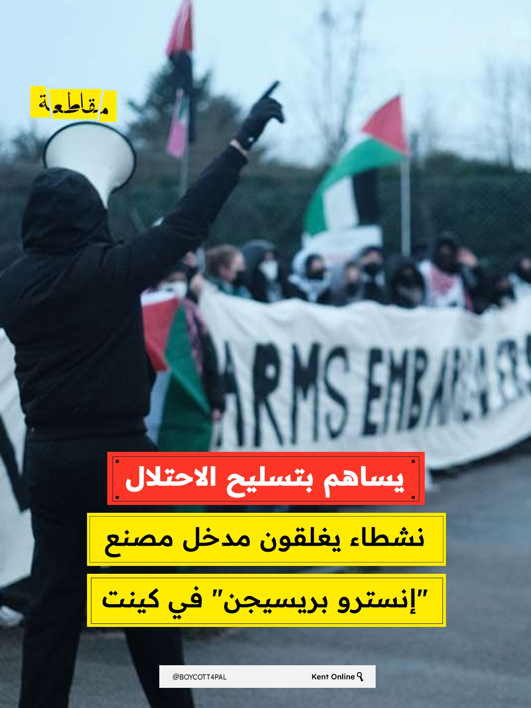 أغلق نشطاء مؤيدون للفلسطينيين، مدخل مصنع تابع لشركة Instro Precision في منتزه ساندويتش ديسكفري بمقاطعة كينت، وذلك في احتجاج هو الثاني خلال أقل من ثلاثة أسابيع، في إطار حملة تصعيدية ضد الشركات المرتبطة بصناعة السلاح الإسرائيلية.