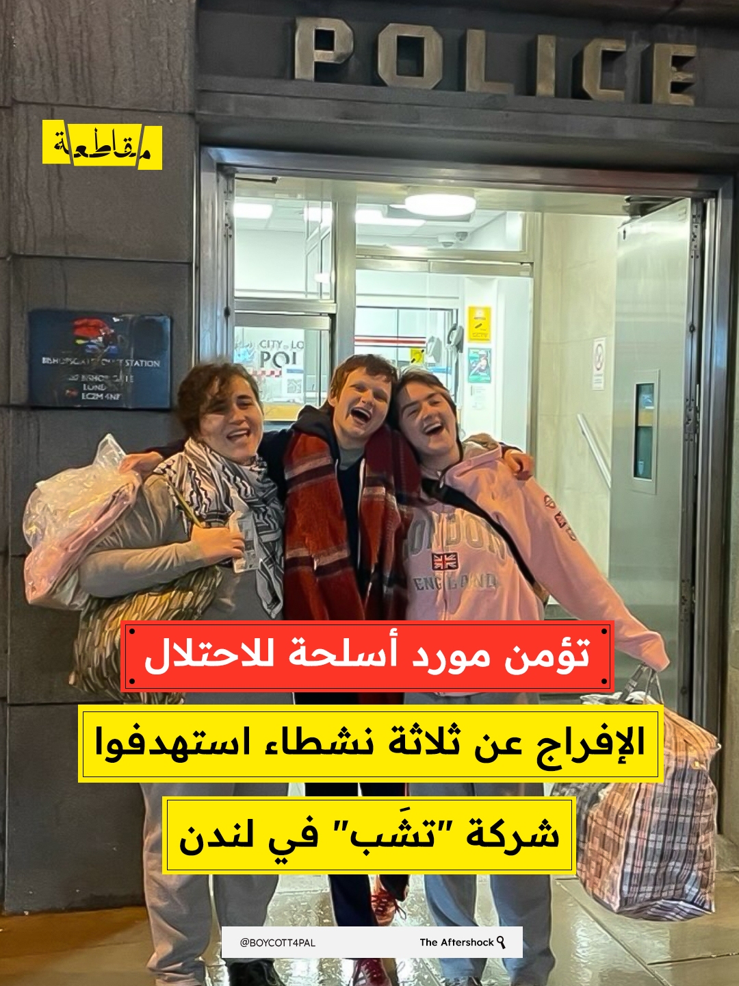 أُفرج عن ثلاثة نشطاء من جماعة “الشعب ضد الإبادة الجماعية” بعد مشاركتهم في تحرّك مباشر استهدف مقر شركة "تشب" في العاصمة البريطانية لندن، احتجاجًا على دورها في تقديم خدمات تأمينية لشركات مرتبطة بالصناعات العسكرية الإسرائيلية.