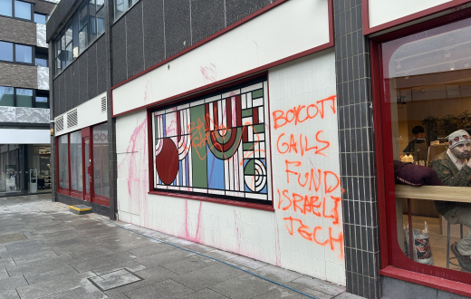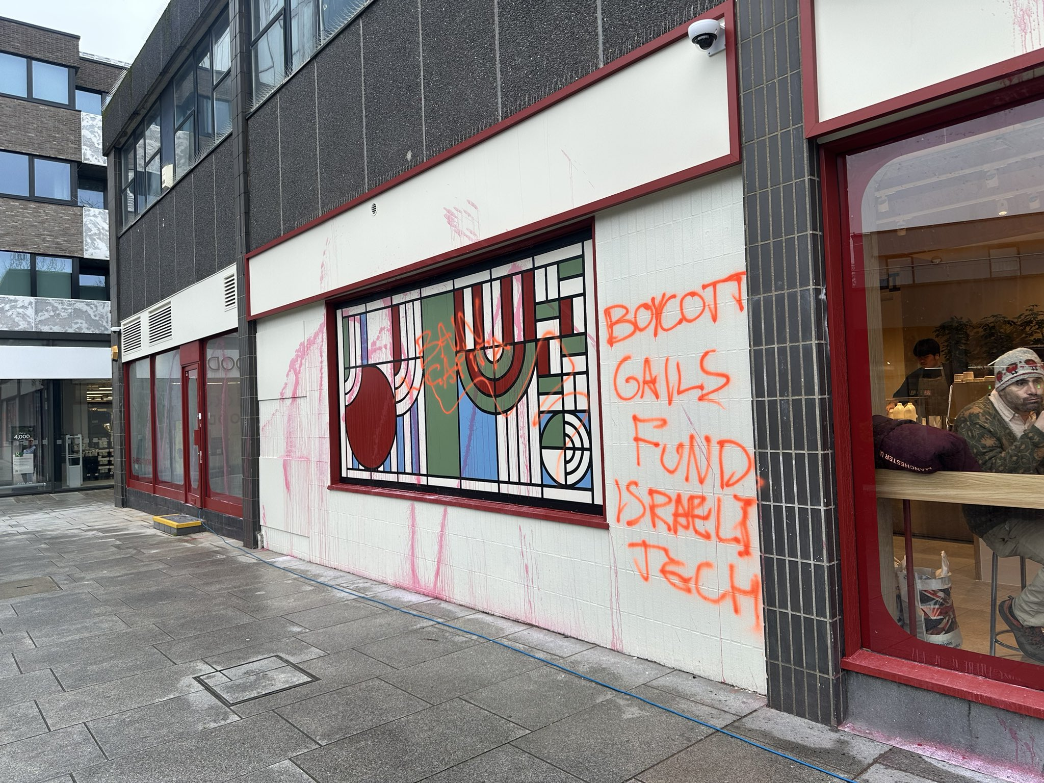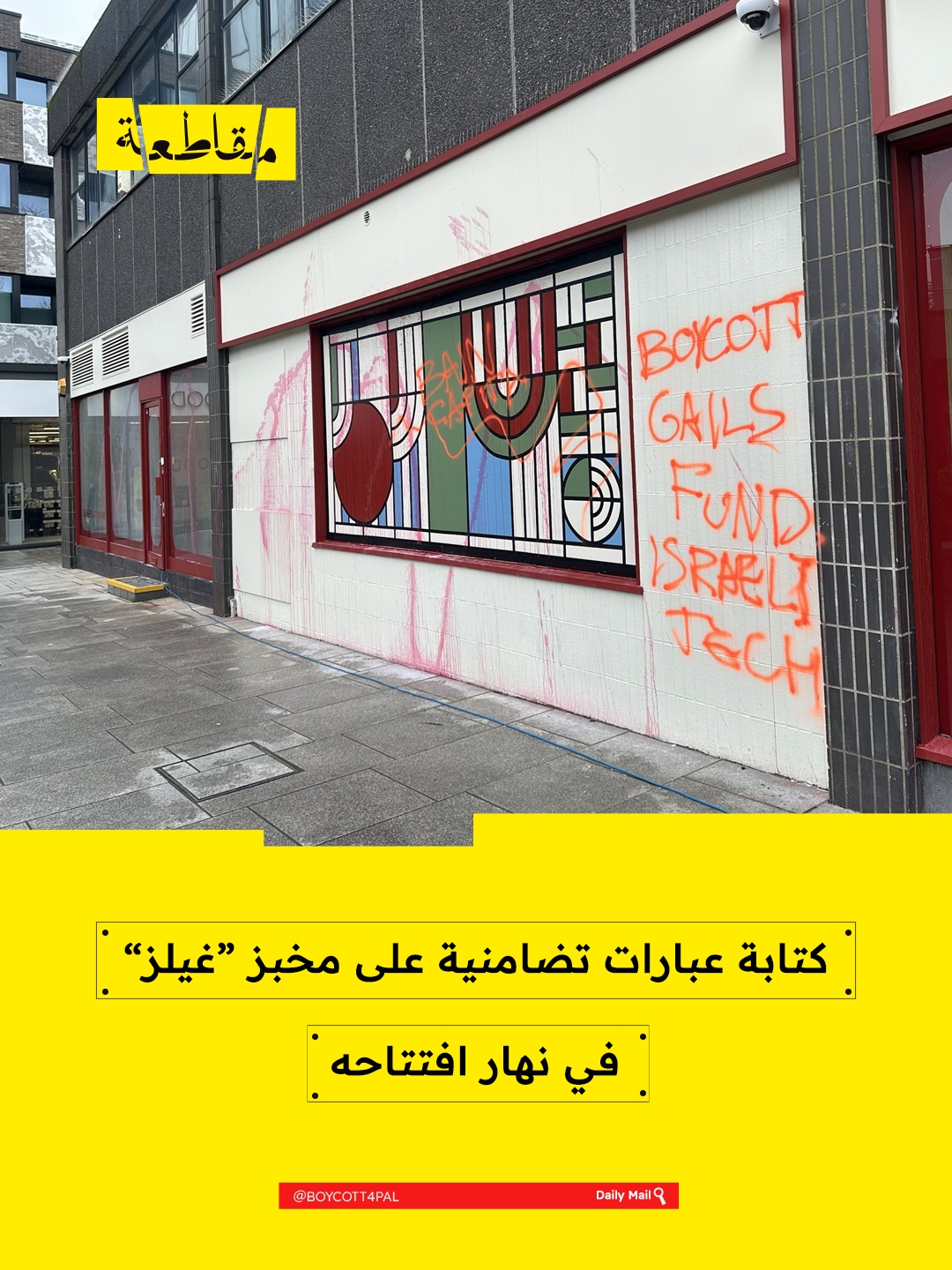 شهد فرع جديد لسلسلة مخابز "غيلز" في شارع جانكشن قرب محطة مترو آرتشواي في العاصمة البريطانية لندن تحرّكًا احتجاجيًا داعمًا لفلسطين، بعد ساعات من افتتاحه، حيث قام محتجون برش الطلاء الأحمر وكتابة شعارات من بينها "حرروا غزة" و"قاطعوا غيلز" على واجهة المتجر.