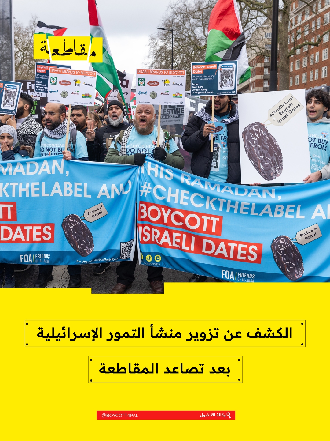 مع اقتراب شهر رمضان المبارك، أطلقت جمعية أصدقاء الأقصى حملتها السنوية للتحقق من ملصقات التمور عند شرائها، بهدف ضمان عدم دعم المنتجات الإسرائيلية ومقاطعتها. وتدعو الحملة جميع المستهلكين لتجنب شراء
