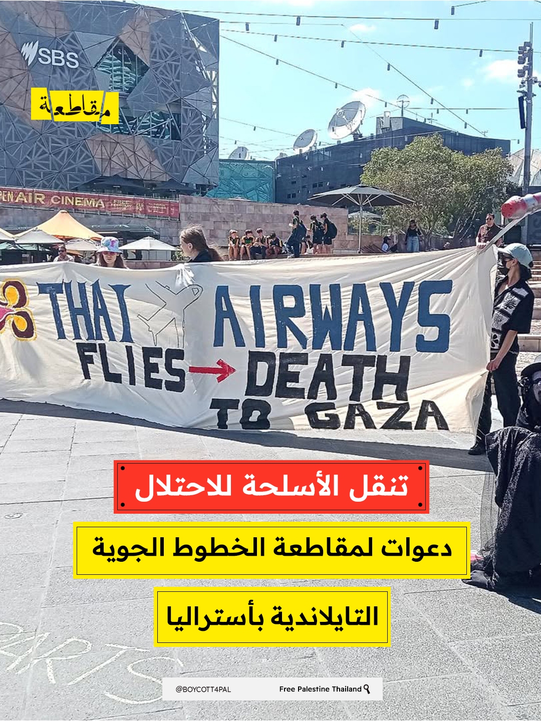 نظّم ناشطون مناهضون لحرب الإبادة على غزة وقفة احتجاجية في ساحة الاتحاد (فيدريشن سكوير) في نارم – ملبورن – بأستراليا، احتجاجًا على دور الخطوط الجوية التايلاندية (Thai Airways International) في نقل شحنات عسكرية مرتبطة بالاحتلال.