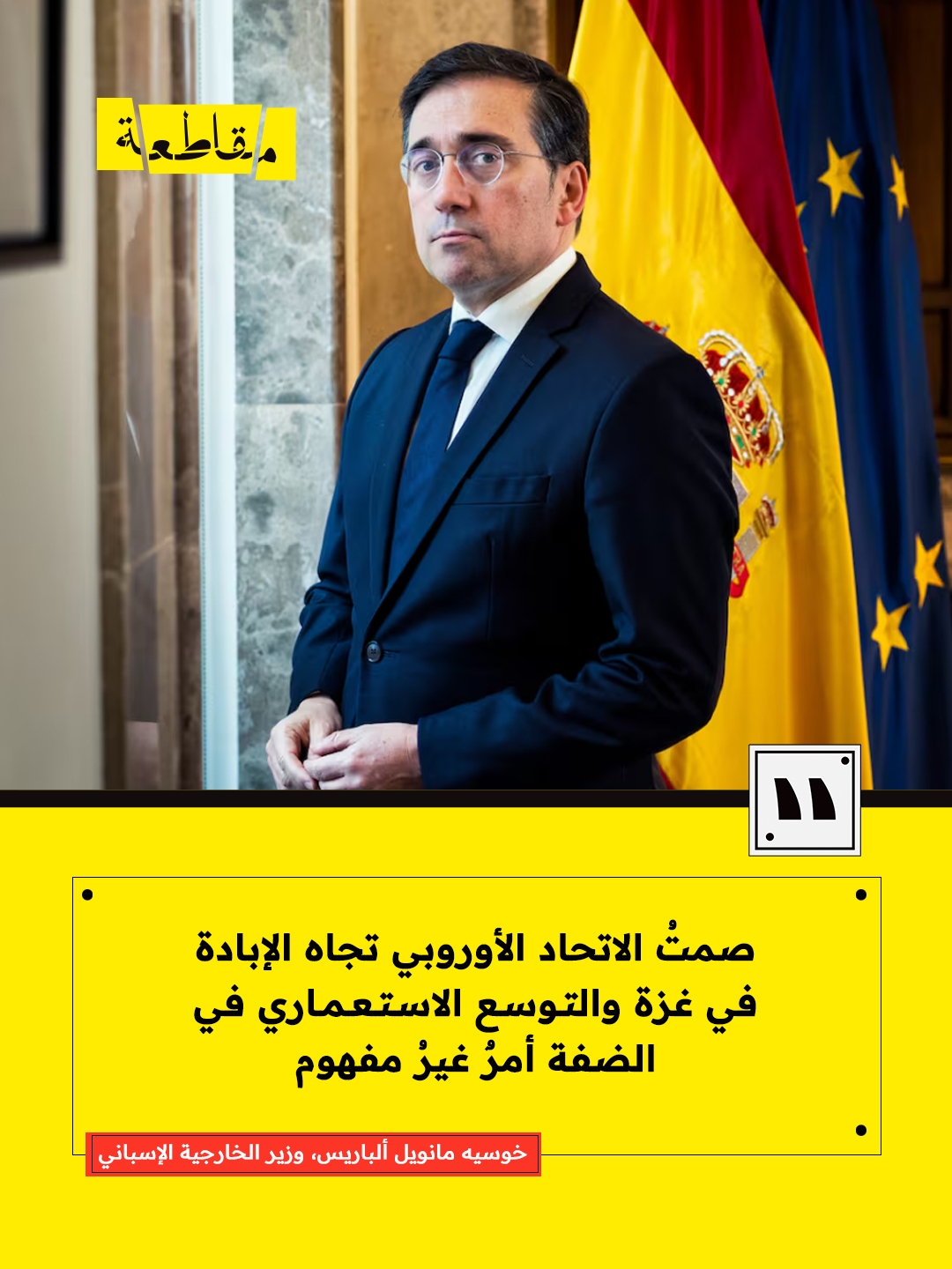 دعا وزير الخارجية الإسباني الاتحاد الأوروبيإلى تبني موقفًا أكثر حزمًا ووضوحًا إزاء الحكومة الإسرائيلية، في ظل استمرار الإبادة الجماعية بحق المدنيين في قطاع غزة وتصاعد سياسات التوسع الاستعماري في الضفة الغربية المحتلة.