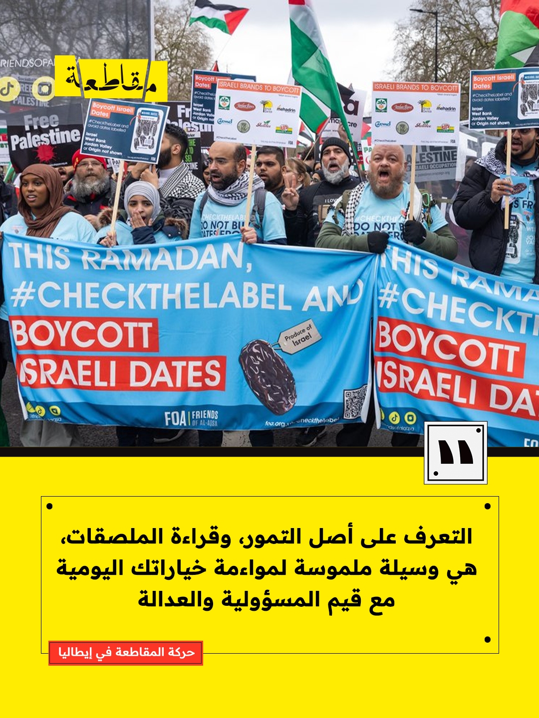 دعت حركة المقاطعة في إيطاليا المستهلكين لتفقد أصل التمور خلال شهر رمضان، مشيرة إلى أن جزءًا كبيرًا من التمور المتوفرة في الأسواق الأوروبية مرتبط بالمستوطنات الإسرائيلية في الضفة الغربية المحتلة.