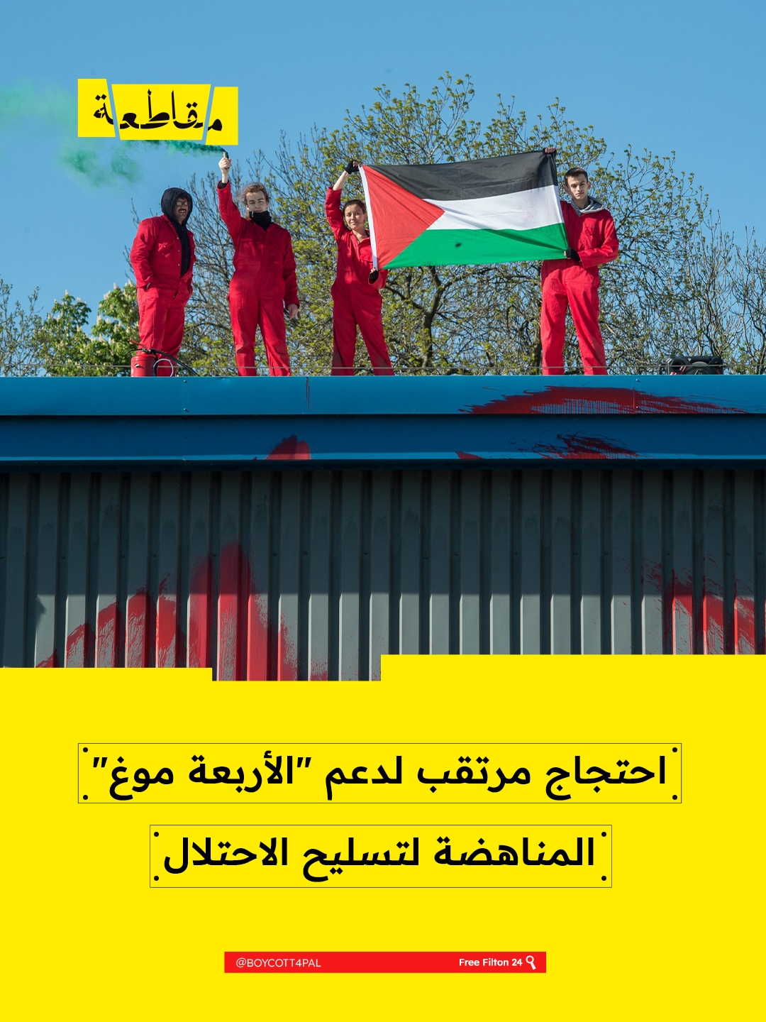 دعت مجموعة “أطلقوا سراح فيلتون 24” إلى تجمع احتجاجي يوم الجمعة 27 فبراير أمام محكمة أولد بيلي في لندن، حيث يتقدّم “الأربعة موغ ” بطلب كفالة لمحكمة إطلاق سراحهم بعد اعتقالهم منذ أغسطس/آب الماضي، بعد تحرّكاتهم للمطالبة بوقف توريد القطع العسكرية لشركة Moog Aircraft Group البريطانية التي يمتدّ نشاطها لصناعة مكونات الطائرات.