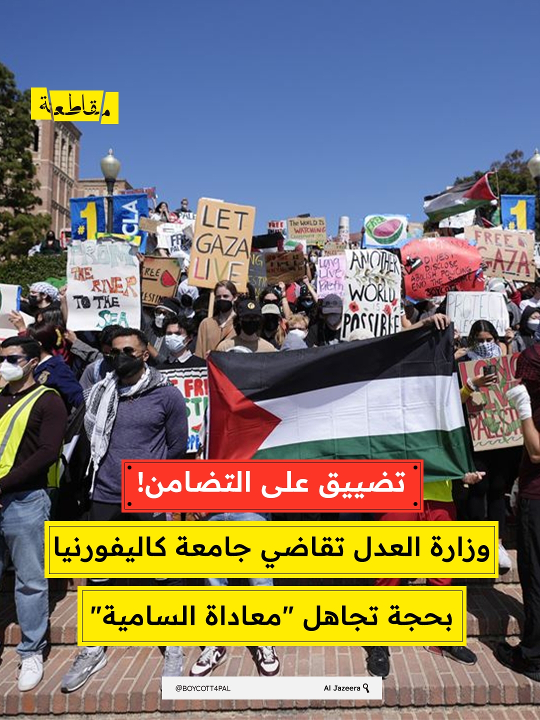 رفعت وزارة العدل الأمريكية دعوى قضائية ضد جامعة كاليفورنيا في لوس أنجلوس (UCLA)، زاعمة أن إدارة الجامعة بالتغاضي عن أعمال معادية للسامية، بل وسهّلتها في بعض الحالات، خلال احتجاجات الطلاب المؤيدة لفلسطين بعد اندلاع حرب الإبادة في غزة.