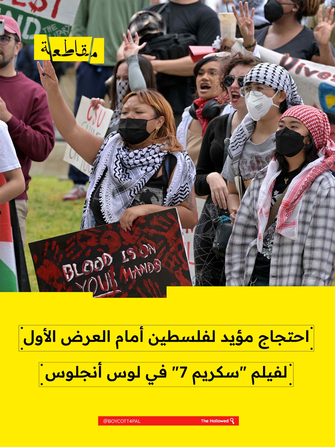 تظاهر عشرات المؤيدين لفلسطين مساء الأربعاء أمام العرض الأول لفيلم Scream 7 في مدينة لوس أنجلوس، رافعين الأعلام الفلسطينية ولافتات تدعو إلى مقاطعة الفيلم ومنصة "باراماونت+". وردد المحتجون هتافات من بينها "قاطعوا سكريم 7" و"حرية فلسطين"، فيما قرع بعضهم الطبول وأطلقوا الأبواق. وأقيم العرض في استوديوهات باراماونت.