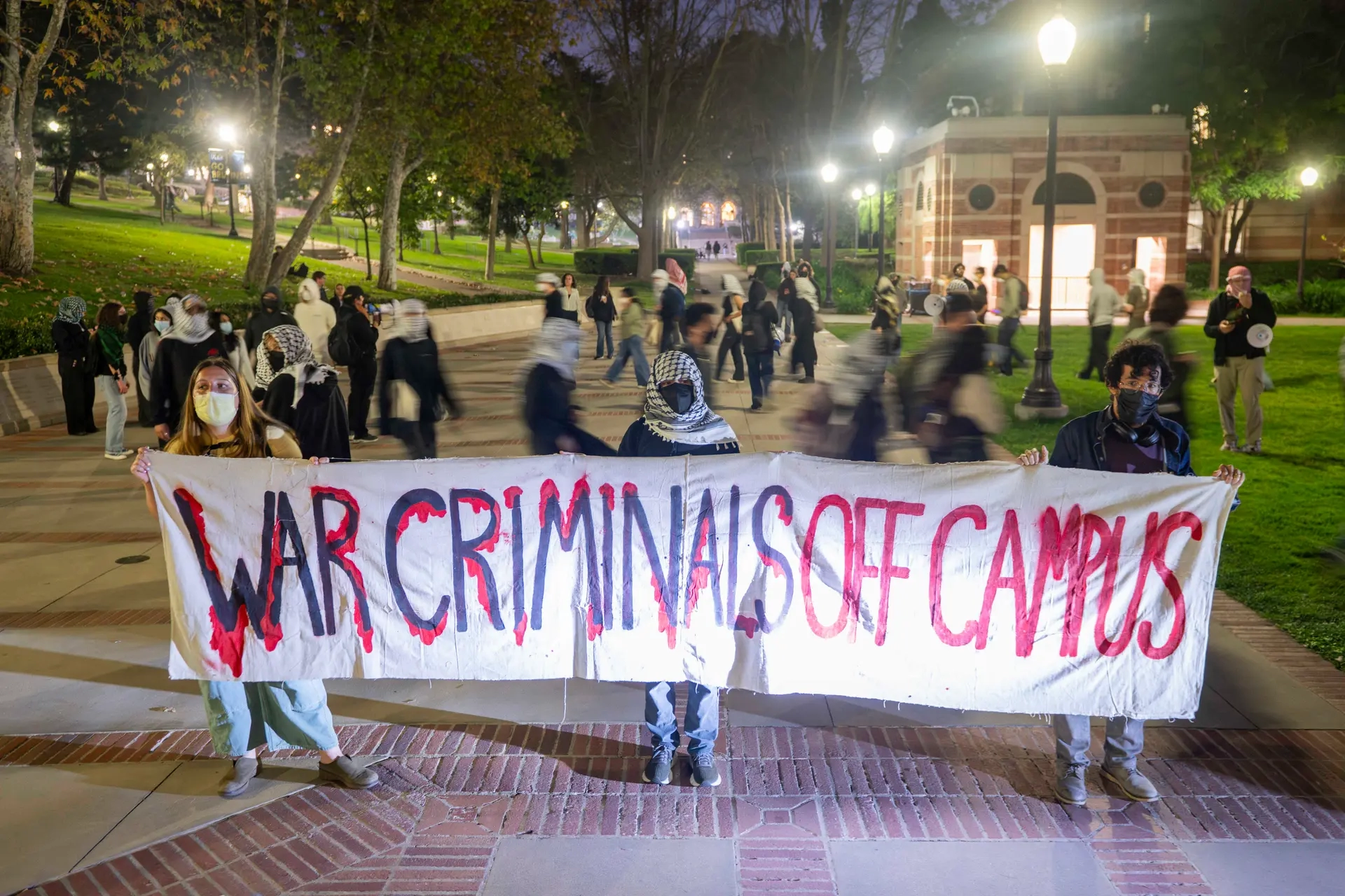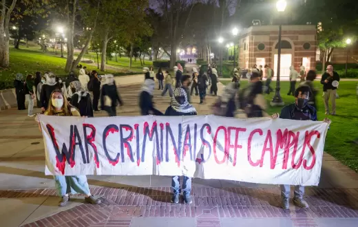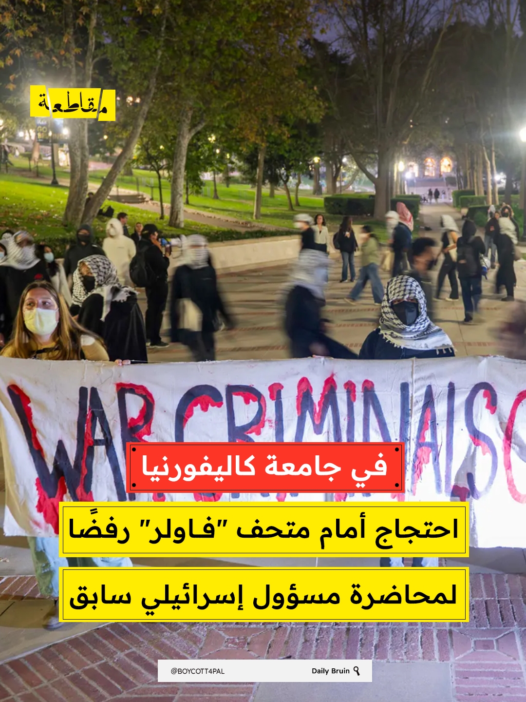 تجمّع نحو 30 متظاهرًا مؤيدًا لفلسطين مساء أمس الأربعاء أمام متحف "فاولر" في حرم جامعة كاليفورنيا في لوس أنجلوس، احتجاجًا على محاضرة ألقاها الدبلوماسي والسياسي الإسرائيلي السابق رونين هوفمان، ضمن فعالية سنوية يستضيفها مركز يونس وثريا نازاريان للدراسات الإسرائيلية.