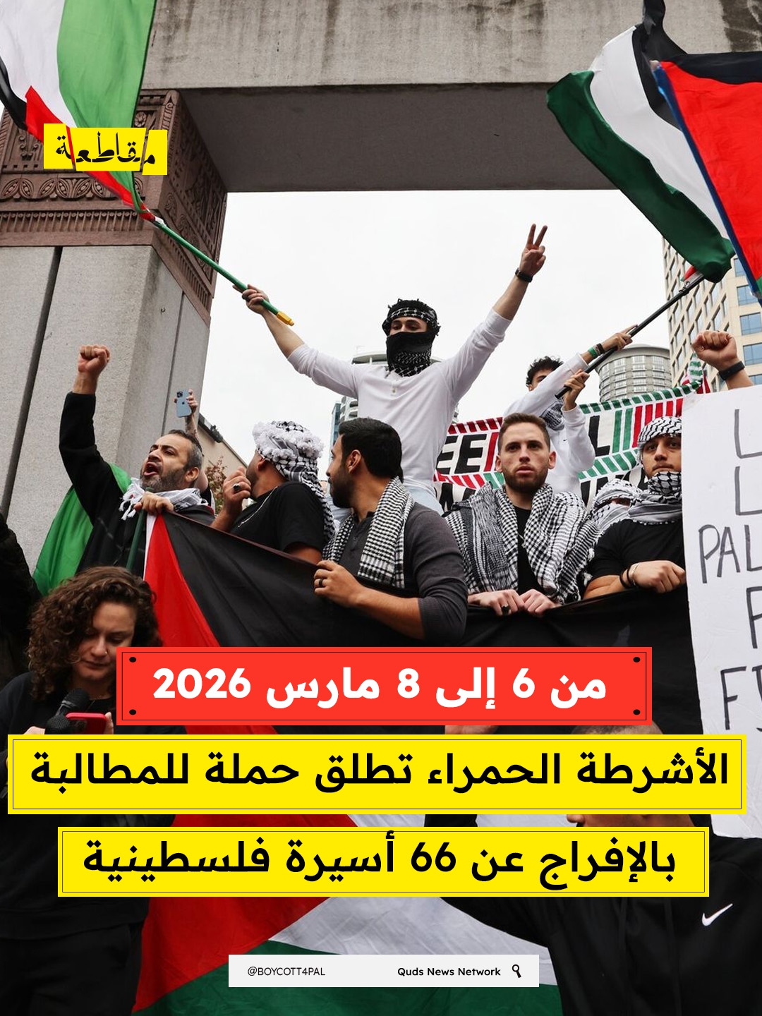 بمناسبة اليوم العالمي للمرأة، تطلق حملة الأشرطة الحمراء أيام عمل عالمية من 6 إلى 8 مارس 2026، للمطالبة بالإفراج عن 66 أسيرة فلسطينية معتقلات في سجون الاحتلال الإسرائيلي. وستنظم مظاهرات ومسيرات وفعاليات عامة في الشوارع والسفارات والأماكن العامة حول العالم، للمطالبة بالعدالة والإفراج عن هؤلاء الأسيرات.