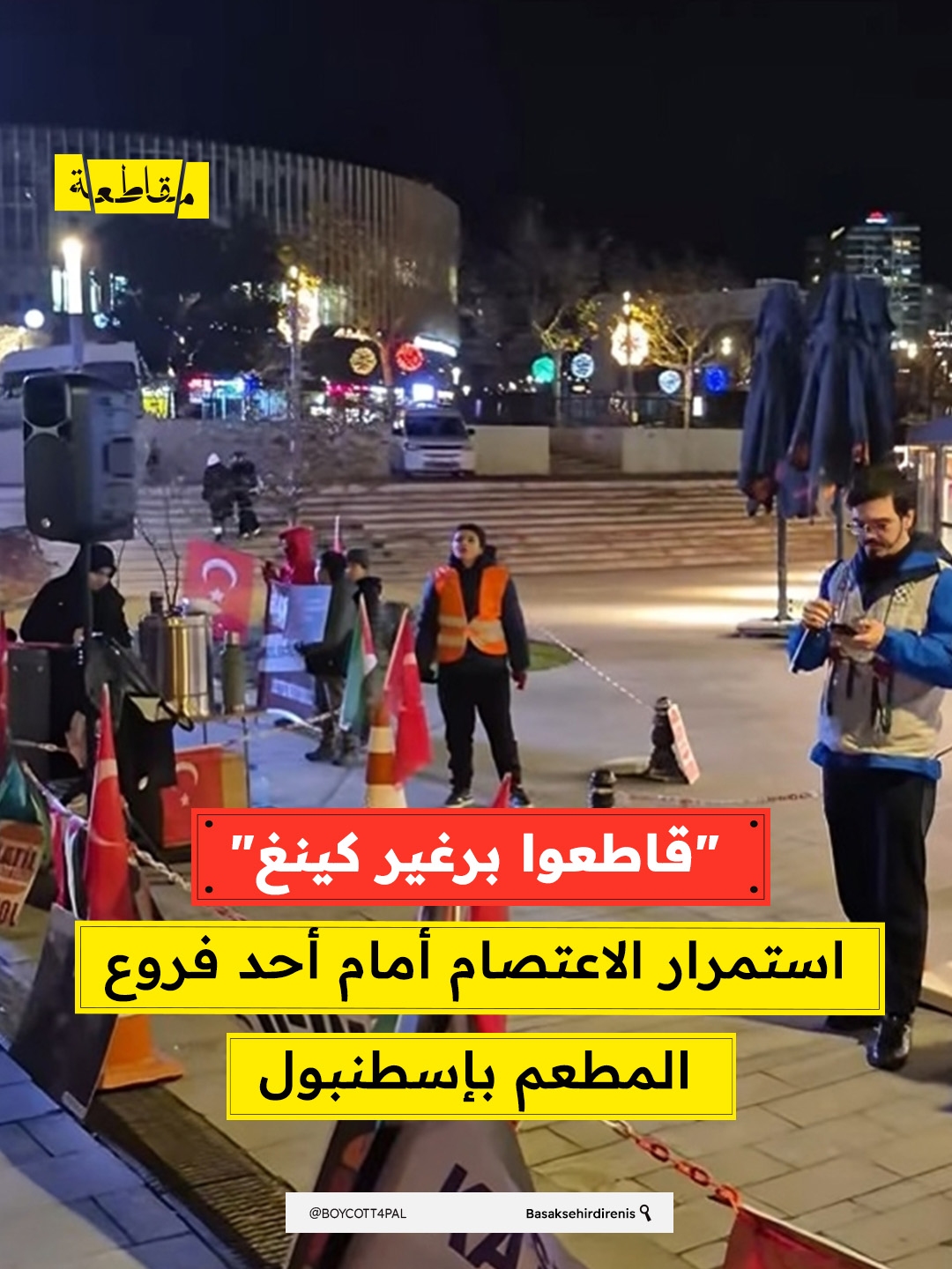 يواصل أنصار فلسطين منطقة باشاك شهير في مدينة إسطنبول باعتصامهم أمام أحد فروع سلسلة مطاعم "برغر كينغ" لليوم الـ 124، حيث دعا المشاركون إلى مقاطعة الشركة ورفعوا شعارات منددة بحرب الإبادة المستمرة في قطاع غزة.