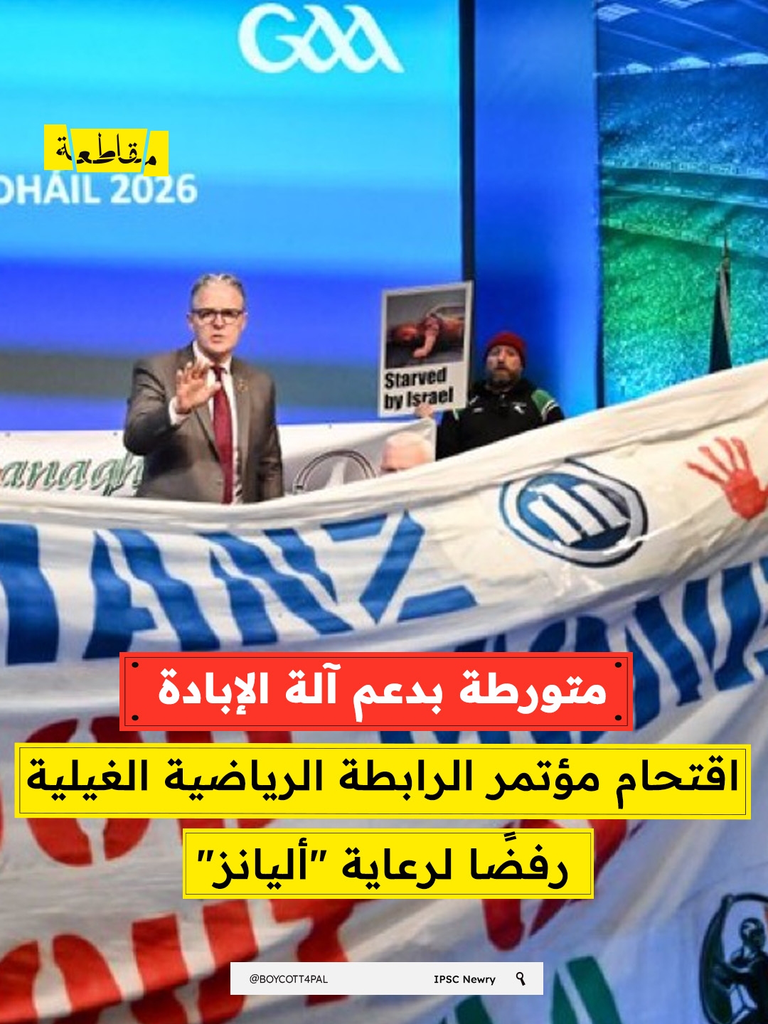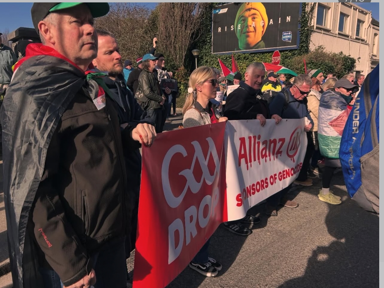 اقتحم محتجون غاضبون قاعة اجتماعات الجمعية العمومية لاتحاد الرياضات الغيلية (GAA) في كروك بارك، احتجاجًا على العلاقة التجارية بين الاتحاد وشركة أليانز، التي تربطها استثمارات مالية وعسكرية مباشرة بشركات تسلح الجيش الإسرائيلي.
