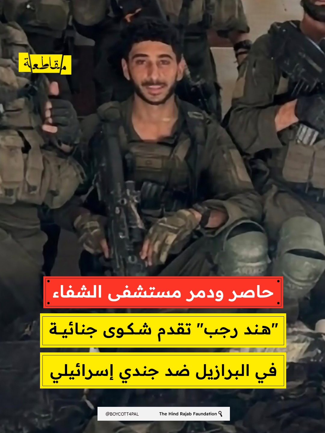 قدّمت مؤسسة "هند رجب" شكوى جنائية في البرازيل ضد الجندي الإسرائيلي عمري تورجمان، من كتيبة المشاة 424 “شاكيد” التابعة للواء جيفعاتي، بتهمة التورط في جرائم حرب وأعمال إبادة جماعية في قطاع غزة.