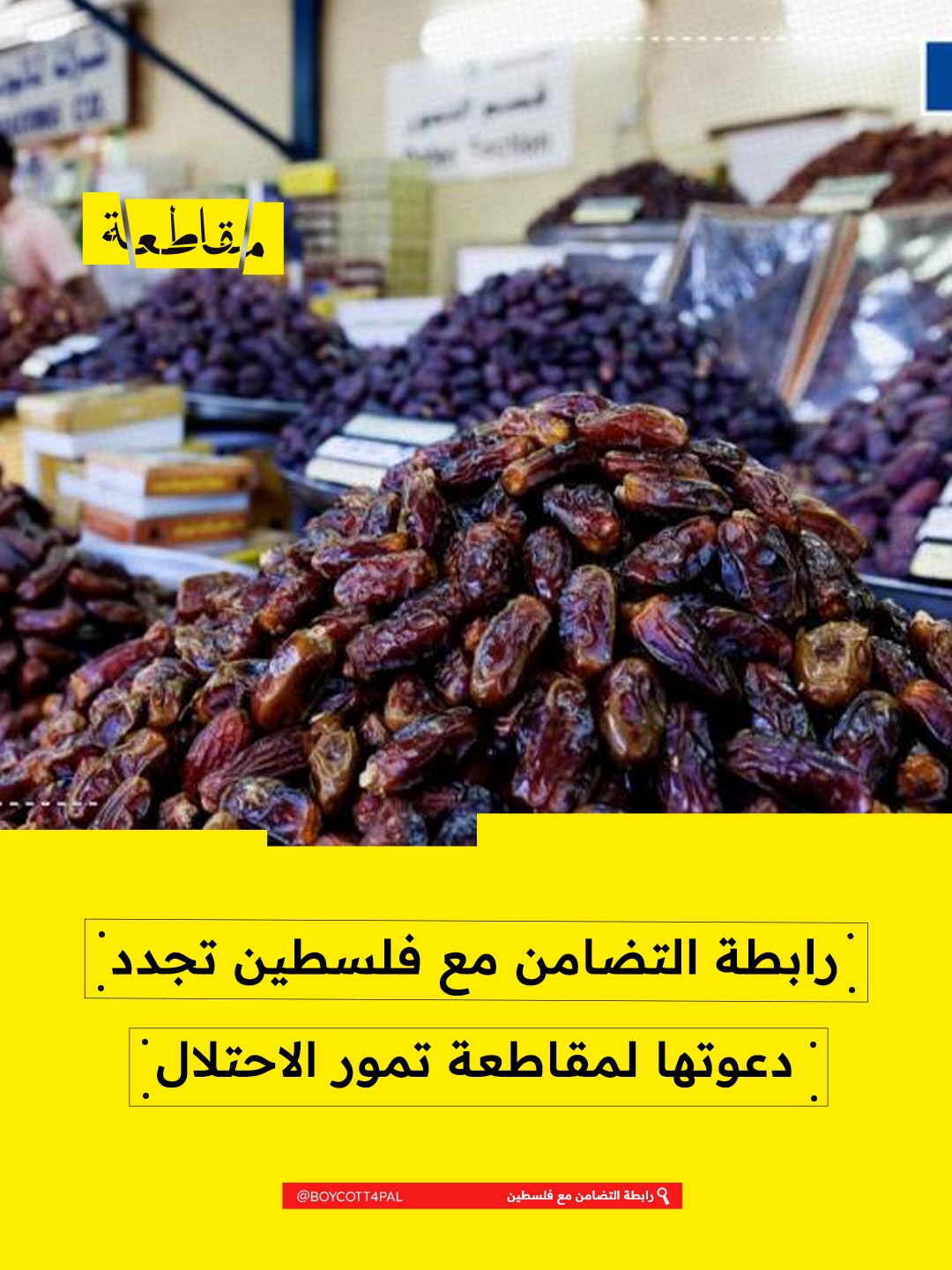 جددت حملات التضامن مع فلسطين دعوتها إلى المستهلكين لمقاطعة التمور الإسرائيلية خلال شهر رمضان، كونها تُزرع في مستوطنات مقامة على أراضٍ فلسطينية مسروقة. ونشرت الجهات المنظمة دليلاً يساعد على التعرّف إلى التمور الإسرائيلية وتجنب شرائها في المتاجر. كما طالبت الجمهور بالتوقيع على عريضة تدعو المتاجر الكبرى إلى إزالة جميع المنتجات الإسرائيلية من رفوفها، في إطار الضغط الشعبي لوقف الاستفادة من الاستيطان غير القانوني.
