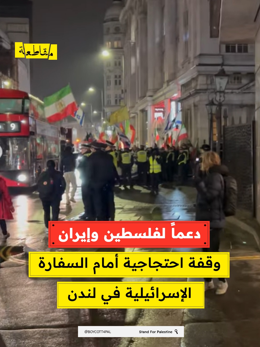 نفذ نشطاء متضامنون مع فلسطين وقفة احتجاجية أمام السفارة الإسرائيلية في العاصمة البريطانية لندن، تنديدًا بالعدوان الإسرائيلي والأمريكي، ودعمًا لفلسطين وإيران.
