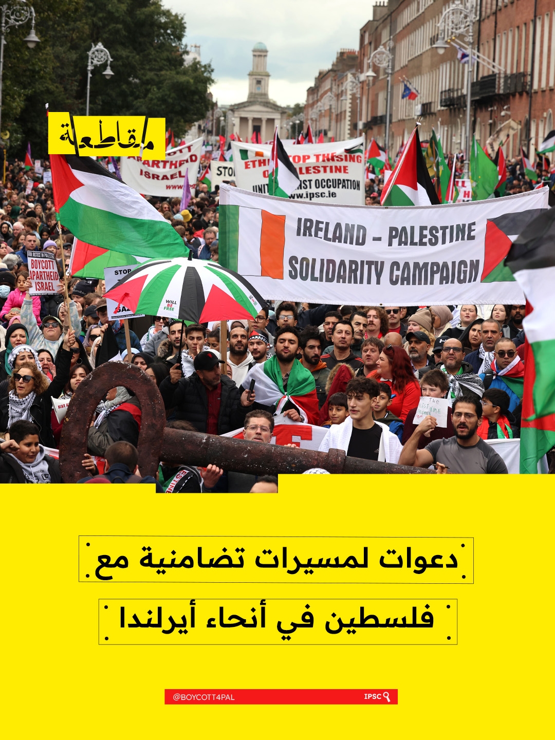 دعت حملة التضامن الأيرلندية مع فلسطين إلى تنظيم سلسلة واسعة من الفعاليات والمسيرات التضامنية في مختلف المدن الأيرلندية يومي 7 و8 مارس، دعمًا للشعب الفلسطيني وتنديدًا بالحرب على غزة.