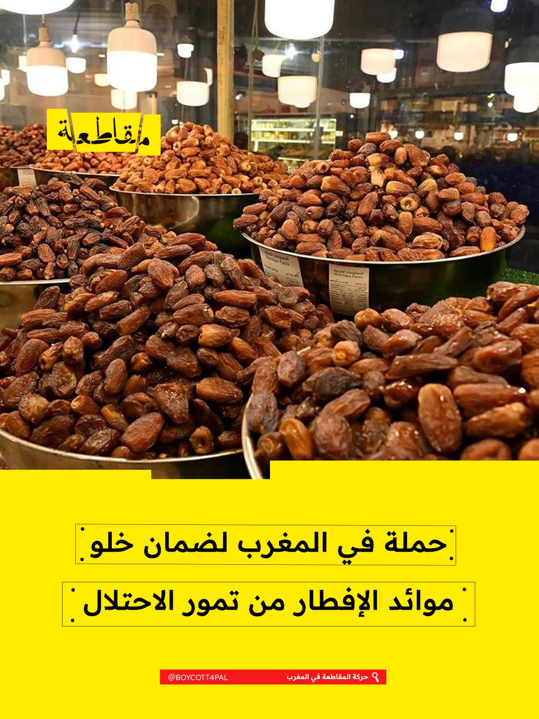 في إطار جهود التضامن مع فلسطين، أطلقت حركة المقاطعة في المغرب حملة توعية لضمان خلو موائد الإفطار الرمضانية من التمور القادمة من كيان الاحتلال. وأكدت الحركة أنها قامت بجولة ميدانية للتأكد من عدم وجود أي تمور تحمل علامات صهيونية أو تُعلن صراحة أنها منتج للكيان الإسرائيلي المحتل.