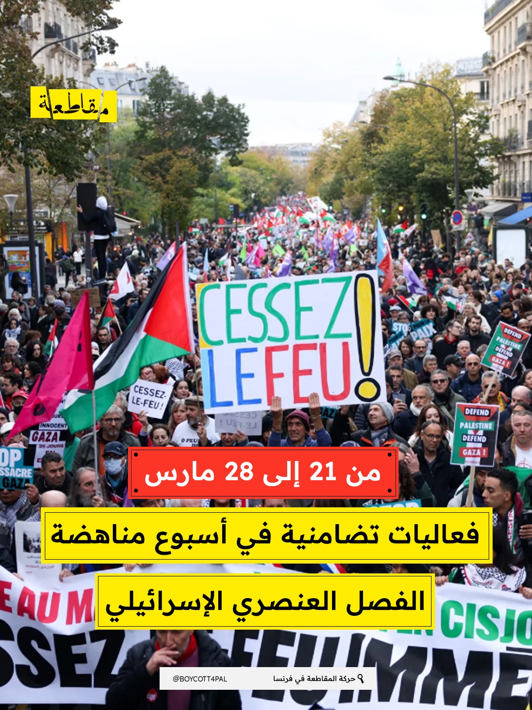 ودعت حركة المقاطعة في فرنسا الجميع للمشاركة في هذه الفعاليات في المدن والجامعات الفرنسية، ضمن حملة تهدف إلى فضح سياسات الاحتلال الإسرائيلي، وإنهاء الاستيطان غير القانوني، والفصل العنصري ضد الفلسطينيين.