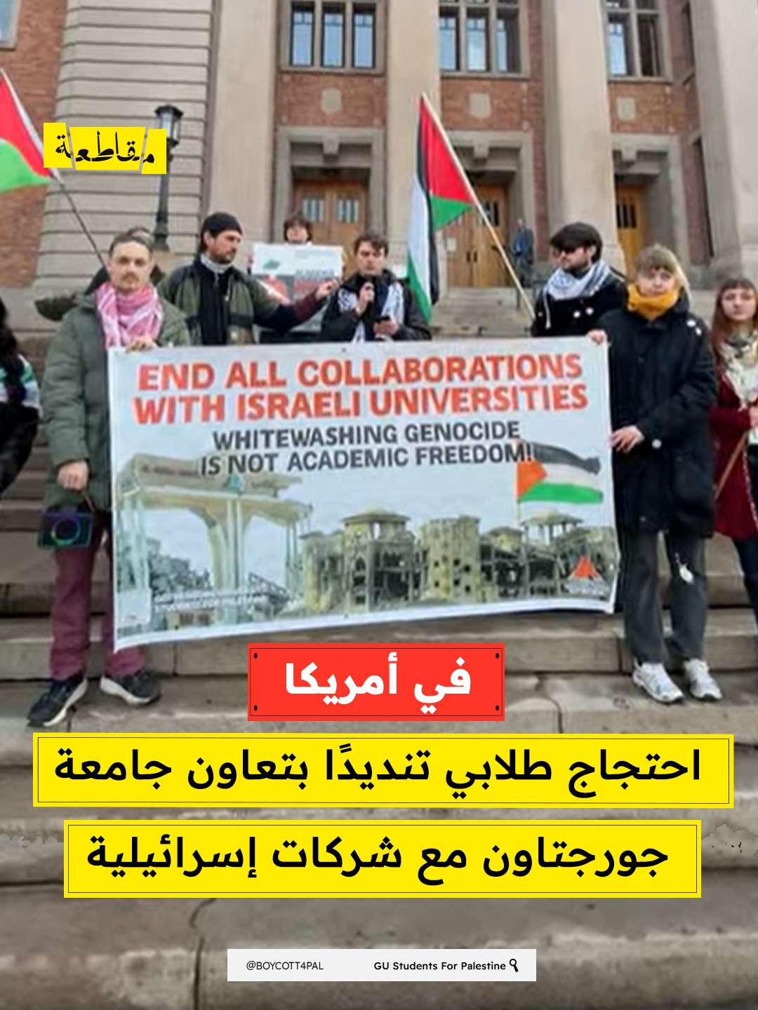 نظّم عدد من طلاب جامعة جورجتاون، في أمريكا، وقفة احتجاجية تنديدًا بعقد الجامعة ندوة حول “الحرية الأكاديمية”، في وقت تتعاون فيه مع مؤسسات إسرائيلية مشاركة بشكل مباشر في جرائم وانتهاكات جسيمة بحق الشعب الفلسطينيين الأعزل.