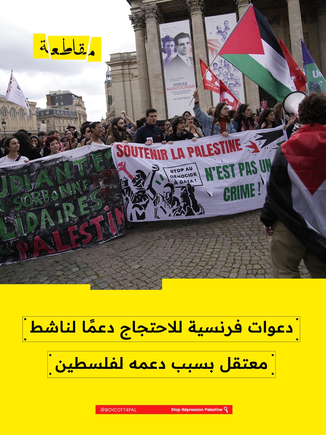 أعلنت عدة مجموعات من بينها اتحاد الطلاب ومجموعة “أوقفوا القمع في فلسطين” في فرنسا عن دعوات للتضامن ودعوات للتجمّع احتجاجًا على اعتقال الناشط المعروف باسم “أليكس”، الذي تم توقيفه مرة أخرى من قبل السلطات الفرنسية بسبب مواقفه العلنية الداعمة للقضية الفلسطينية والمقاومة الفلسطينية، وهو ناشط في Ligue de la jeunesse révolutionnaire (رابطة الشباب الثوري) وعُرض لمحاكمة بتهمة “الترويج لأعمال تعتبرها الدولة إرهابية” بسبب تعبيره عن دعمه للقضية الفلسطينية في فعاليات عامة.