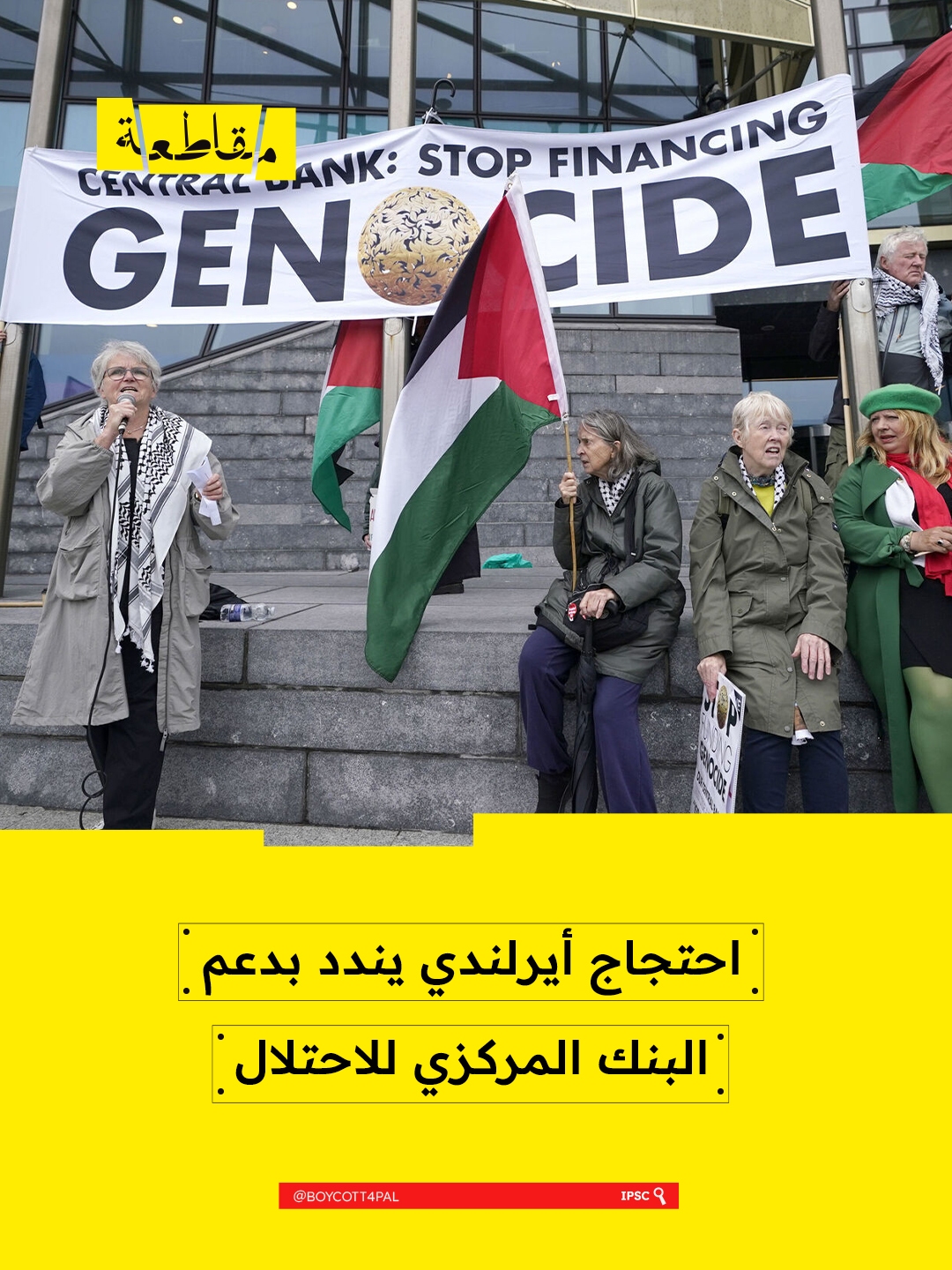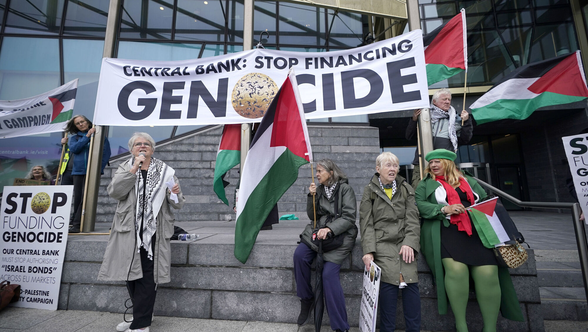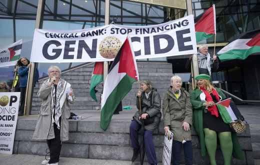 احتجت مجموعة حملة التضامن الأيرلندية مع فلسطين أمس أمام البنك المركزي في دبلن، للمطالبة بوقف الدعم المالي والإجراءات التي تسهم في استمرار الاعتقالات التعسفية والإبادة الجماعية التي يتعرض لها الفلسطينيون، بما في ذلك الأطفال، على يد الاحتلال الإسرائيلي.