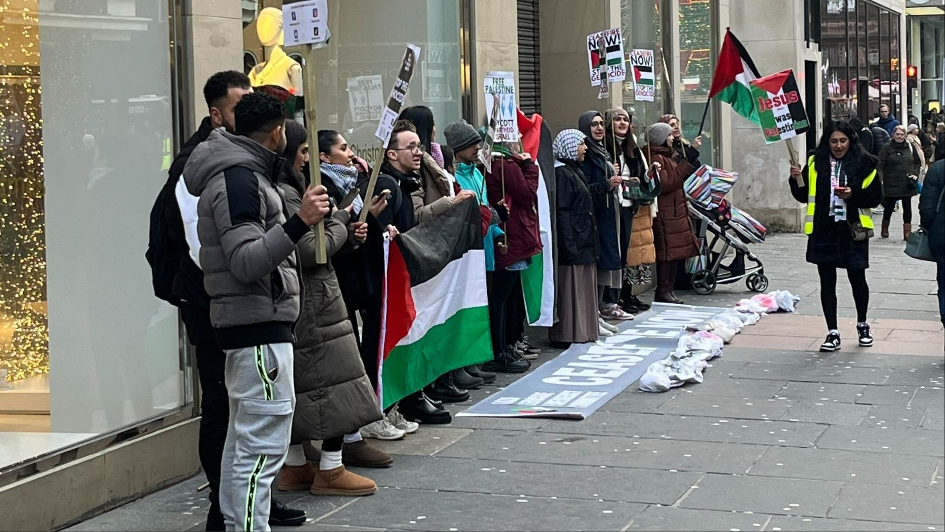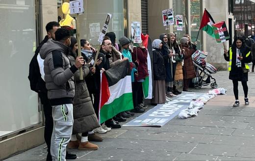 نظم نشطاء من حركة المقاطعة وقفة احتجاجية أمام أحد فروع متجر "زارا" في شارع باوكانان بمدينة غلاسكو، بريطانيا، وذلك ضمن نشاطهم الأسبوعي لتوعية المتسوقين بشأن دعم الشركة للاحتلال الإسرائيلي.