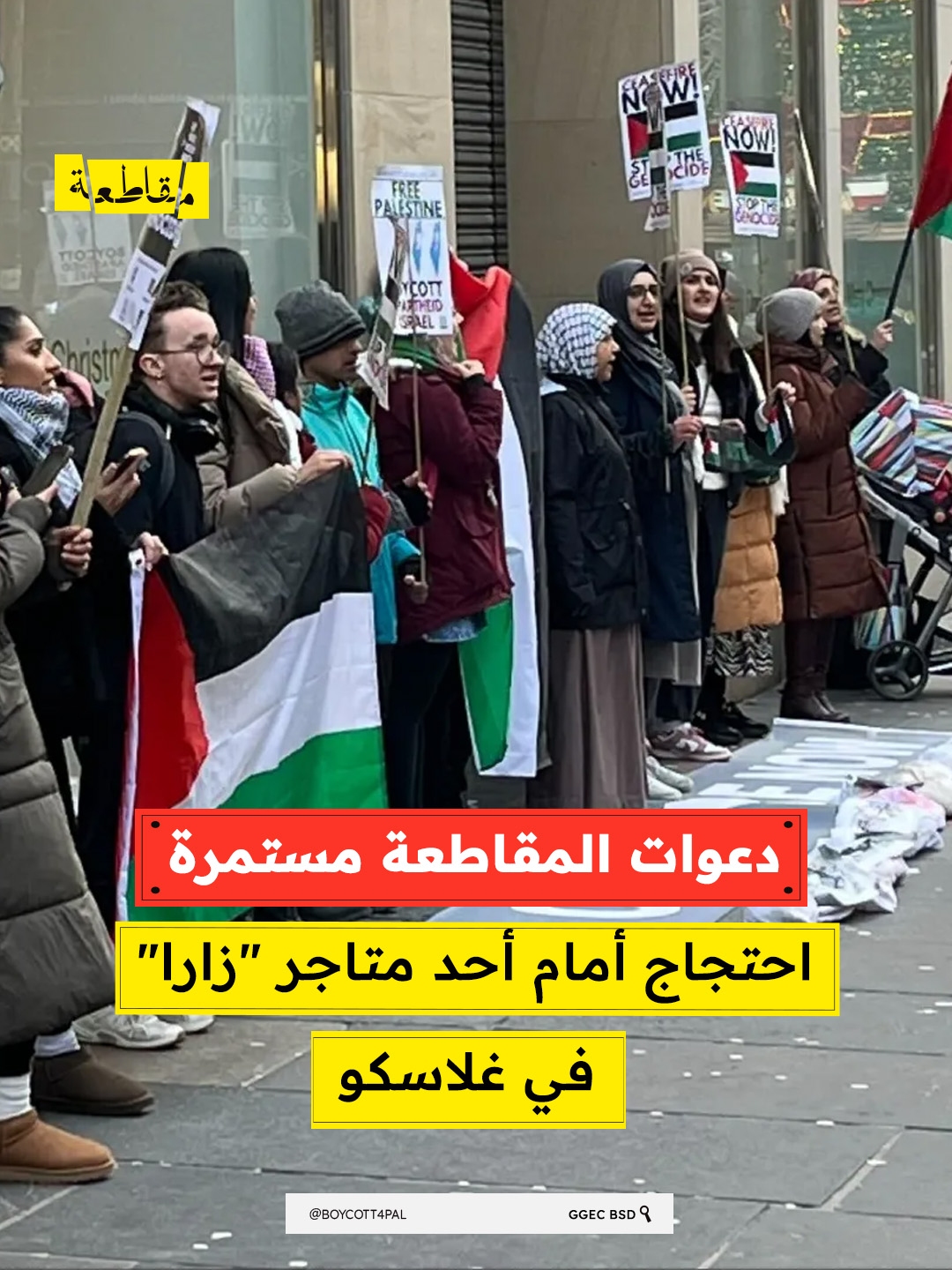 نظم نشطاء من حركة المقاطعة وقفة احتجاجية أمام أحد فروع متجر "زارا" في شارع باوكانان بمدينة غلاسكو، بريطانيا، وذلك ضمن نشاطهم الأسبوعي لتوعية المتسوقين بشأن دعم الشركة للاحتلال الإسرائيلي.