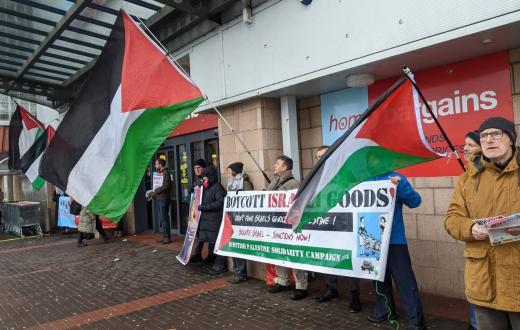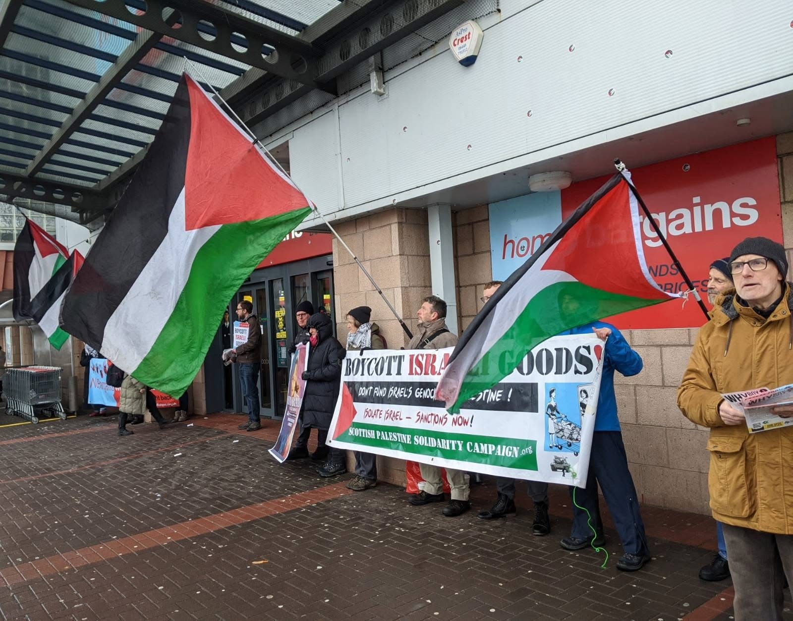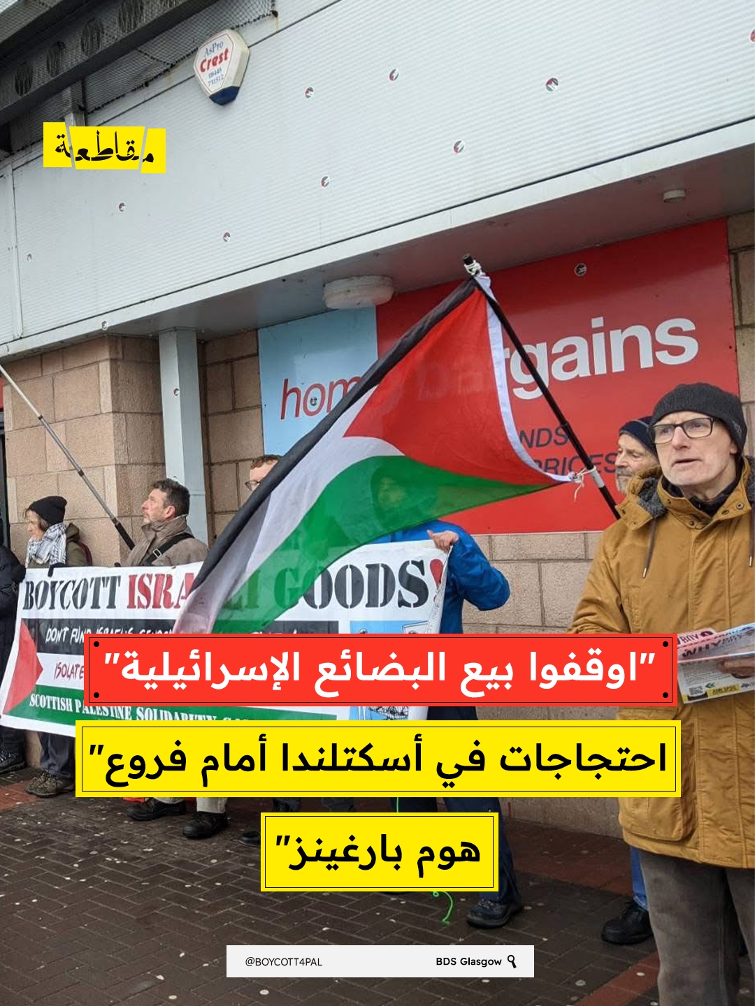 نفذ نشطاء حركة المقاطعة في مدينة غلاسكو، أسكتلندا وقفة احتجاجية أمام أحد فروع متجر "هون بارغينز"، قاموا خلالها بتوزيع منشورات على المارة تدعو إلى مقاطعة المتجر بسبب بيعه لمنتجات إسرائيلية.