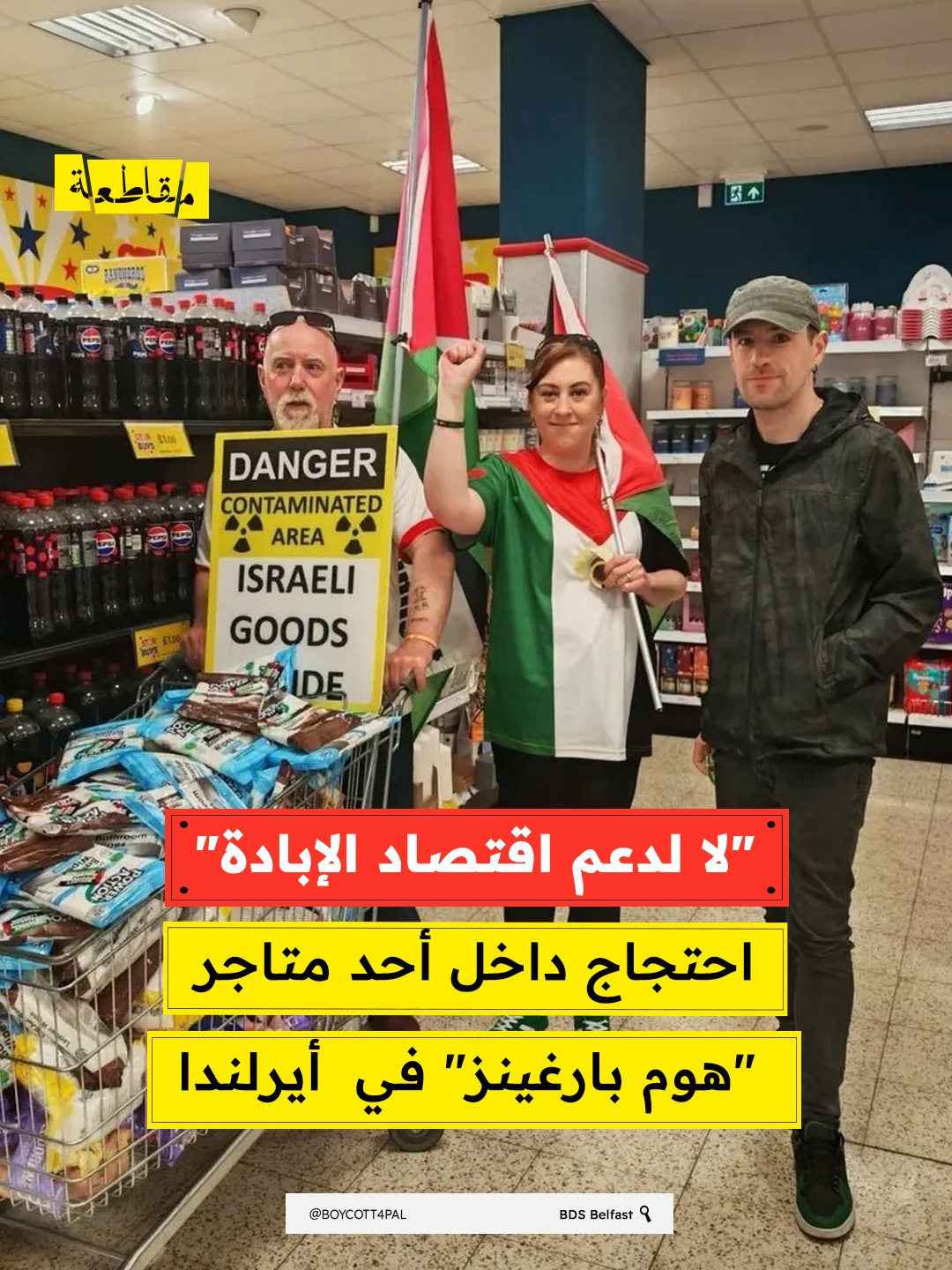 احتج نشطاء من "حركة المقاطعة" في مدينة بلفاست ، أيرلندا ، داخل أحد متاجر "هوم بارغينز"، حيث أزالوا منتجات إسرائيلية من الرفوف ووضعوا عليها ملصقات داعمة لفلسطين، داعين الزبائن إلى مقاطعتها لأنها تسهم في دعم اقتصاد الإبادة. مجددين دعوتهم للمتجر لوقف بيع جميع المنتجات المصنعة في "إسرائيل".