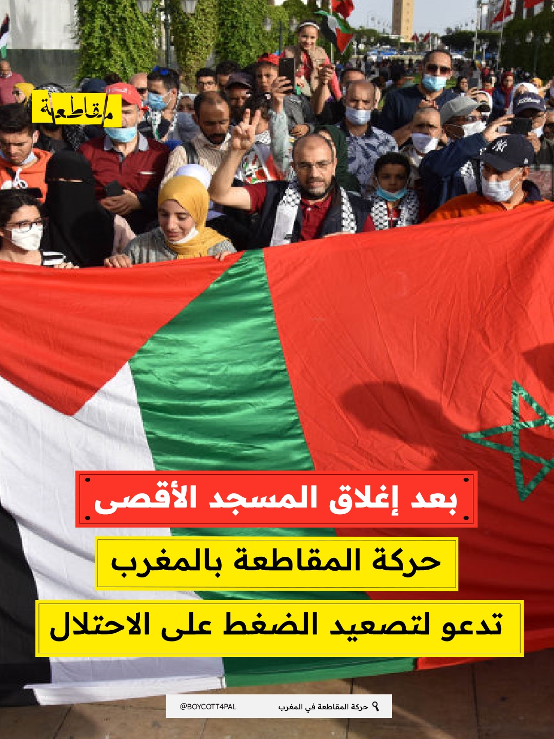 جددت حركة المقاطعة في المغرب دعوتها لتصعيد المقاطعة والضغط على الاحتلال للوصول لعزله وإيقاف انتهاكاته بحق الشعب الفلسطيني، معتبرةً أن مواصلة الاحتلال لإغلاق المسجد الأقصى يعتبر تصعيد خطير ويهدف لتغيير الواقع الديني والتاريخي.