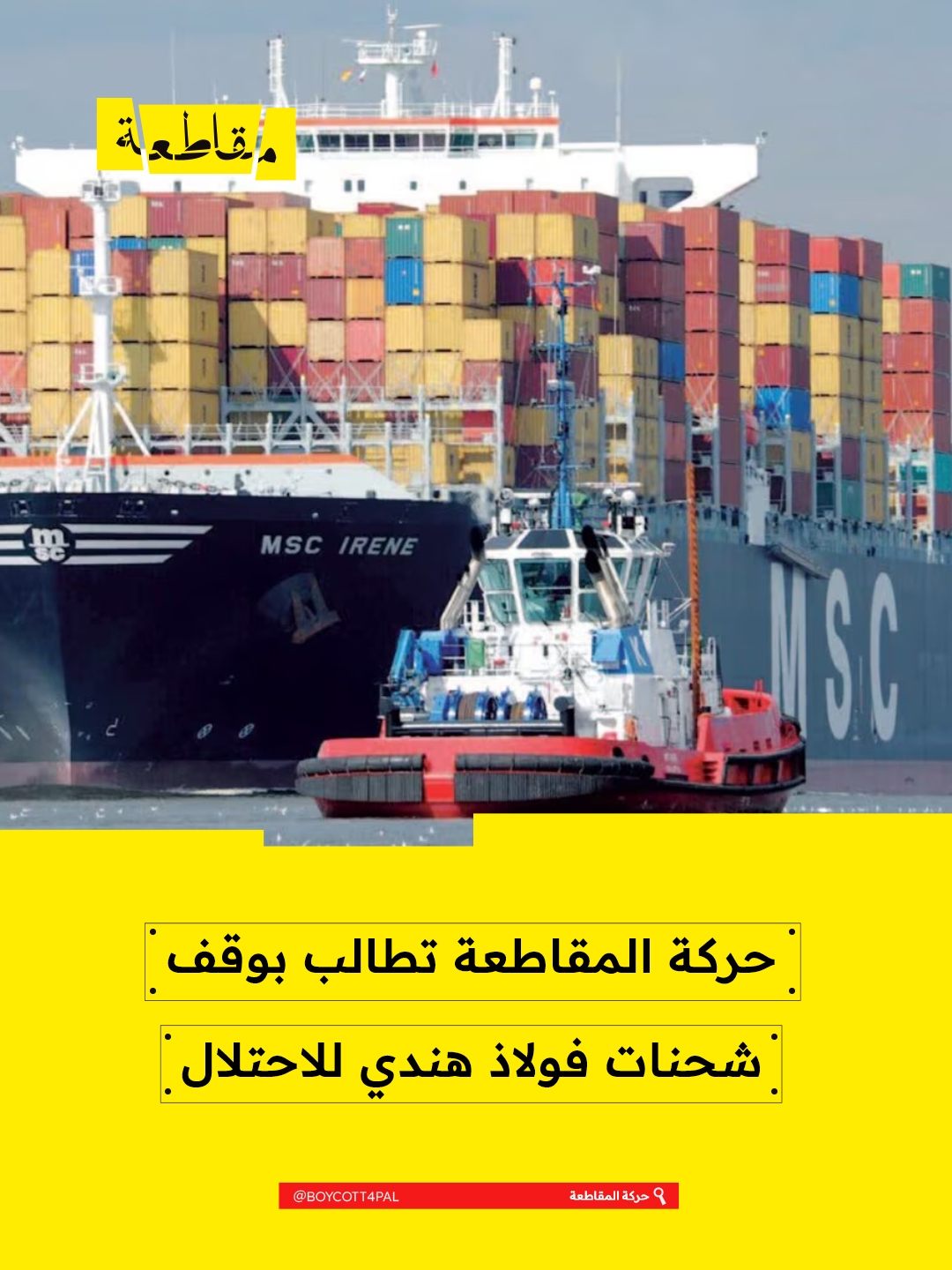 دعت حركة المقاطعة إلى وقف شُحنات شركة إم إس سي للشحن المتوسطي السويسرية والتي تنقل الفولاذ العسكري من الهند إلى “إسرائيل” التي تمارس الإبادة بحق الشعب الفلسطيني.