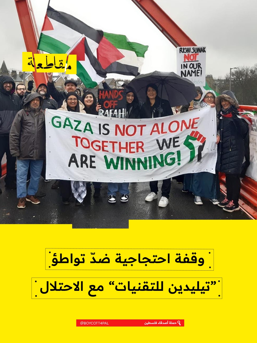نظّمت حملة أصدقاء فلسطين في برادفورد ببريطانيا وقفة احتجاجية ضدّ فرع شركة “تيليدين للتقنيات” الأمريكية لتورطها في قتل المدنين في فلسطين ولبنان وإيران، وقد رفع المشاركون لافتات تُدين الشركة وتطالب بوقف أنشطتها.