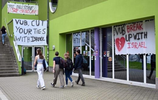 ورفع المتظاهرون لافتات كبيرة كُتب عليها “جامعة بروكسل الحرة تُساعد في قتل الفلسطينيين”، بالإضافة إلى رفع صور لشخصيات فلسطينية قتلها الاحتلال.