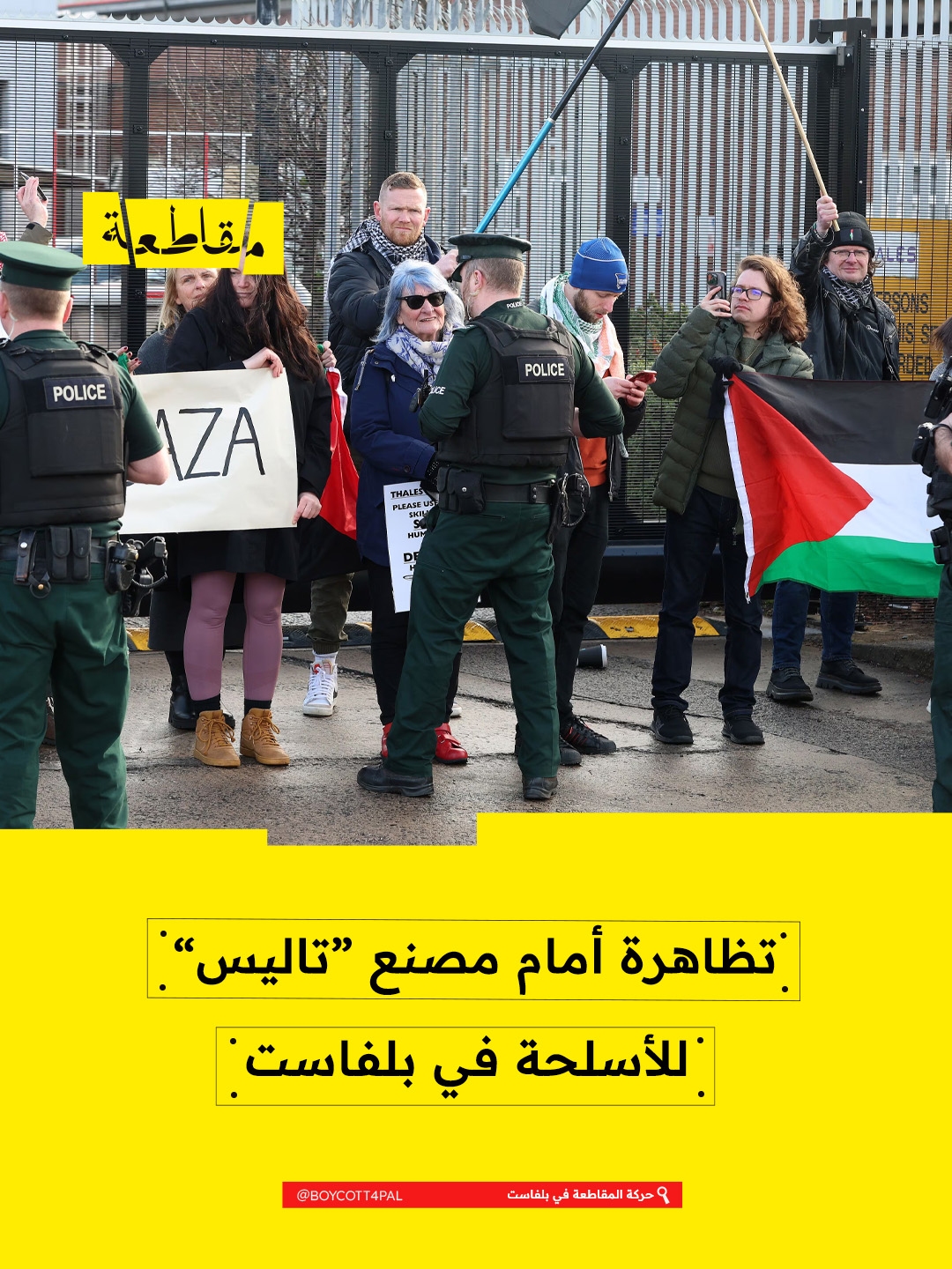 تظاهر عشرات المتضامنين ونشطاء حركة المقاطعة أمام مصنع “تاليس” للأسلحة في بلفاست بإيرلندا تنديدًا بتزويده الاحتلال بالأسلحة وبالتالي مشاركته في حرب الإبادة التي يشنها الاحتلال بحق الفلسطينيين، متهمينه بتزويد الأنظمة المشبوهة حول العالم، بما فيها الولايات المتحدة الأمريكية بالأسلحة.