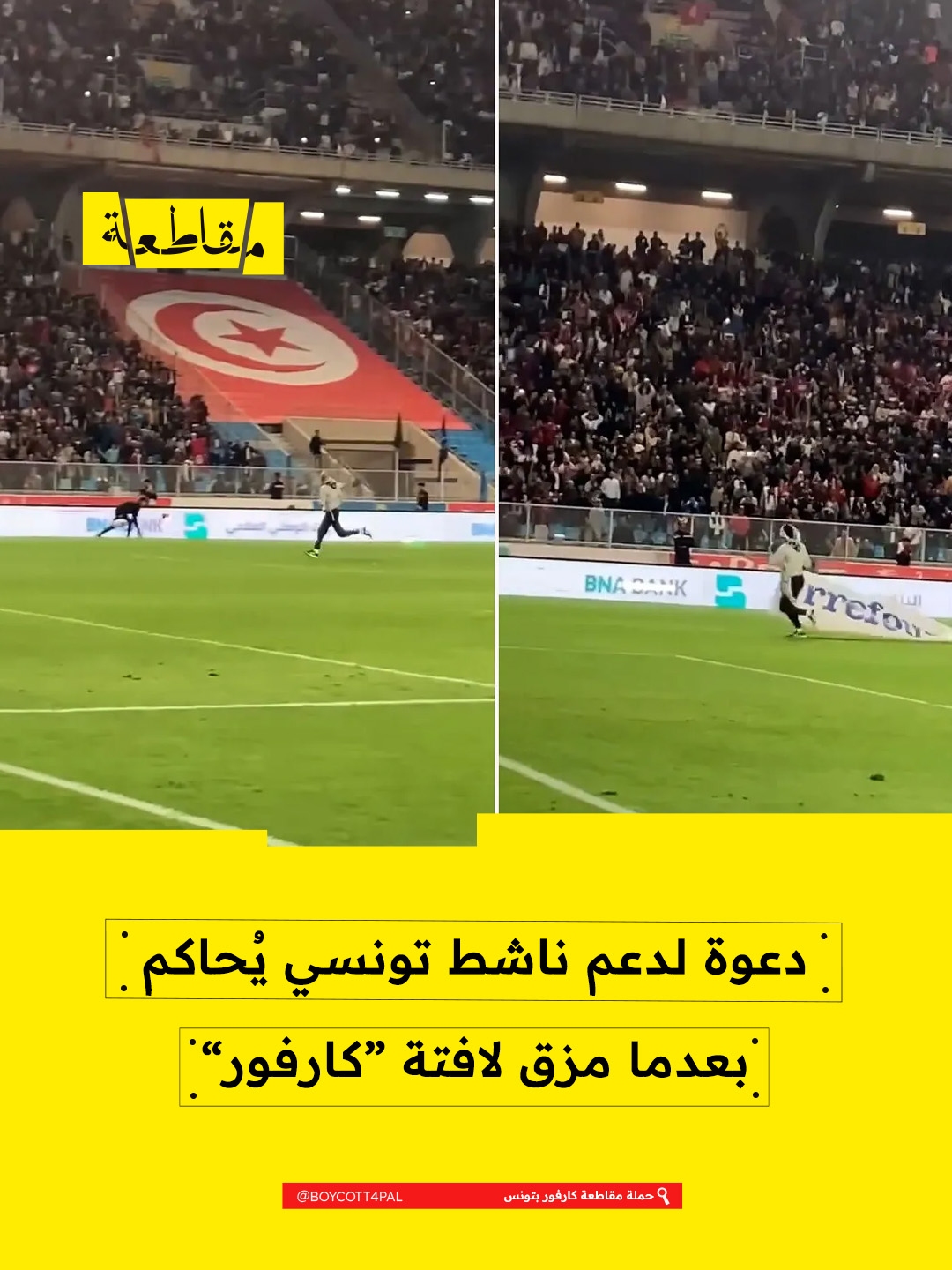 أشارت حملة مقاطعة كارفور بتونس إلى أن 26 مارس هو موعد محاكمة الناشط محمد أميد الطويهري، الذي احتج سلميًا في ملعب على رعاية شركة كارفور الفرنسية – الإسرائيلية، ممزقًا لافتة “كارفور” خلال احتجاجه.