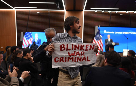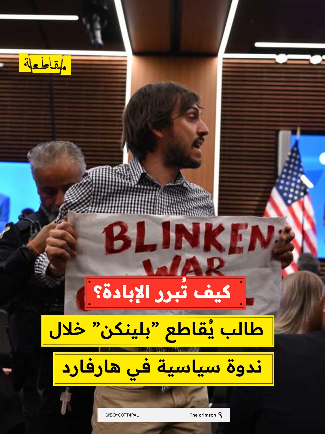 قاطع طالب من جامعة هارفارد وزير الخارجية الأمريكي السابق “أنتوني بلينكن” خلال محاضرة في معهد السياسة بالجامعة عُقدت الثلاثاء 24 مارس، حول تبريراته بتسليح “إسرائيل” رغم خوضها حرب الإبادة في غزة.