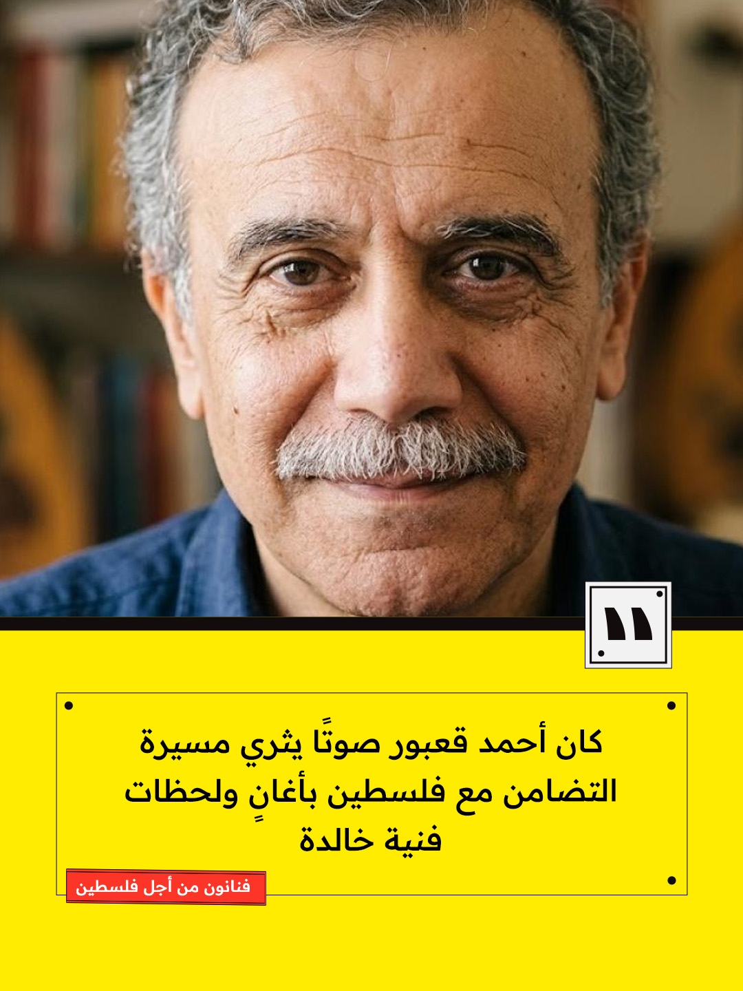 نعت “فنانون من أجل فلسطين” الفنان اللبناني الكبير أحمد قعبور (1955–2026)، معربين عن تقديرهم لالتزامه الطويل بدعم الشعب الفلسطيني من خلال فنه الموسيقي والإنساني.