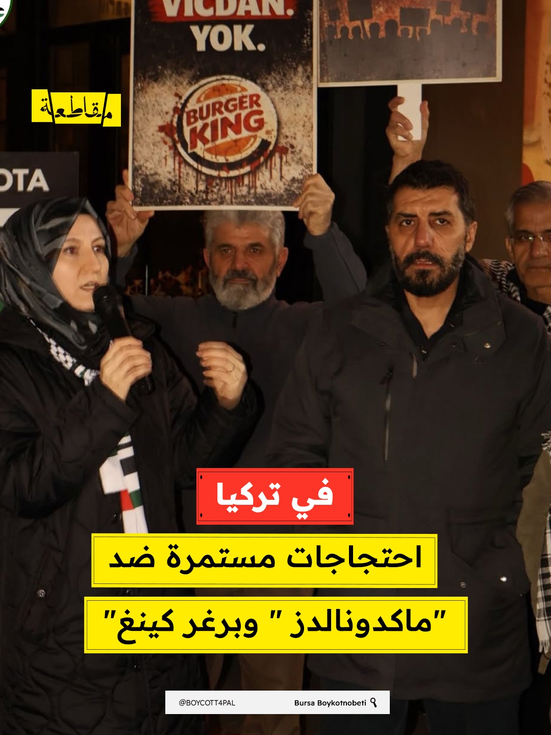 وفي بورصة، نفذ أنصار القضية الفلسطينية وقفة أمام فروع شركة "برغر كينغ"، دعوا خلالها المواطنين إلى مقاطعة الشركات المتواطئة مع الاحتلال، ونشر رسائل الدعم لحملات المقاطعة.