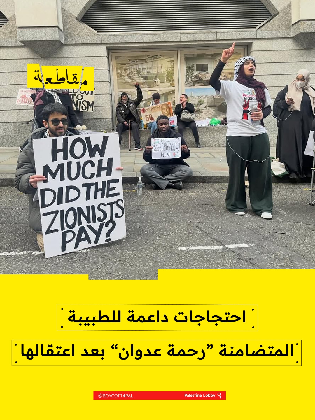 احتجّ عدد من أعضاء مجموعة "فيلتون 24" ومجموعات داعمة للفلسطينيين أمام مركز شرطة تشارينغ كروس في لندن، تضامنًا مع الطبيبة رحمة عدوان، التي اعتُقلت للمرة الخامسة.