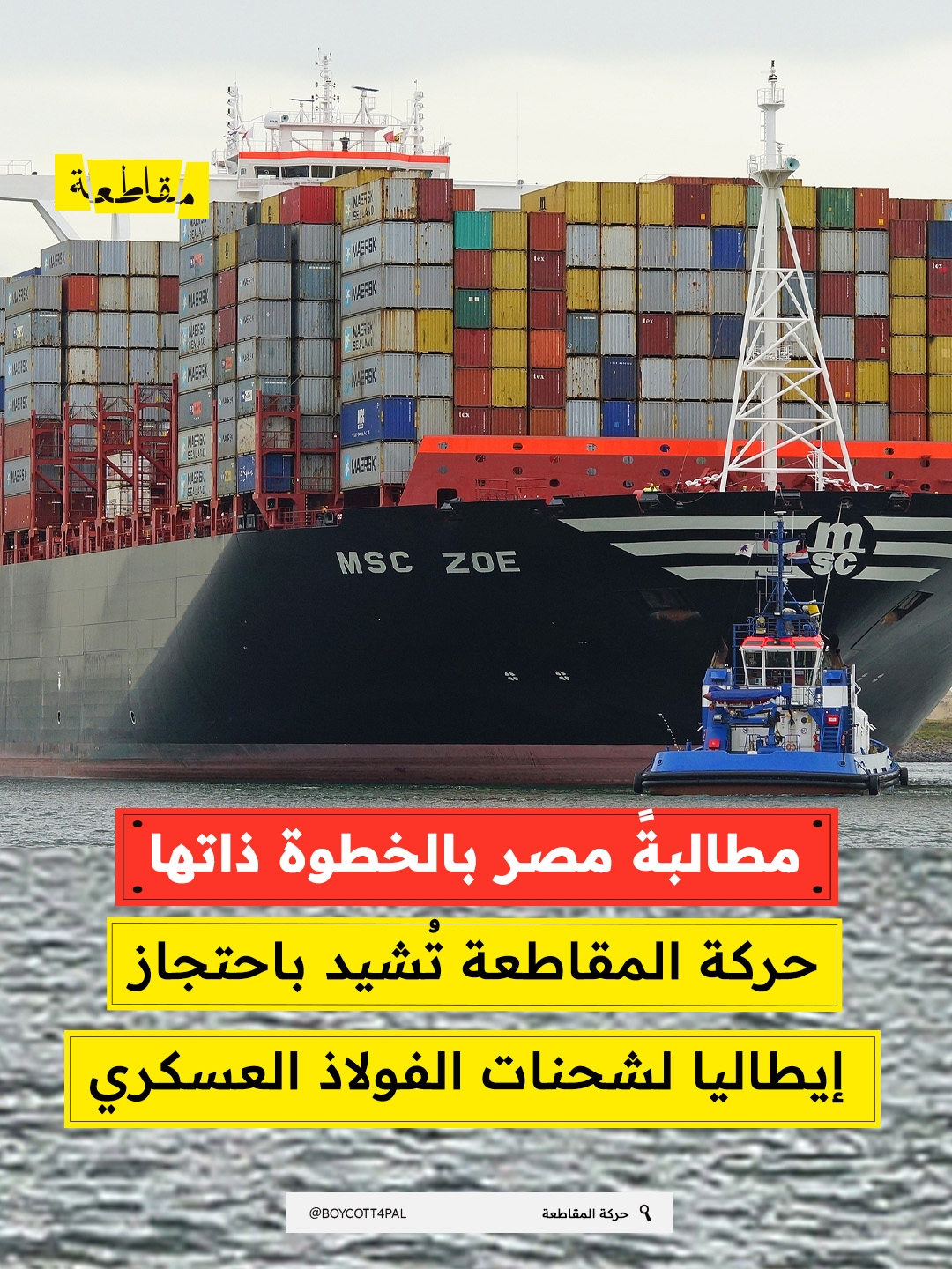 أطلقت حركة المقاطعة وعدّة منظمات دولية داعمة لفلسطين، دعوات للشعب المصري بنقاباته وأطره للضغط على الجهات المسؤولة لمنع سفينة (MSC Danit)، المحمّلة بالفولاذ العسكري من استخدام الموانئ المصرية لإيص